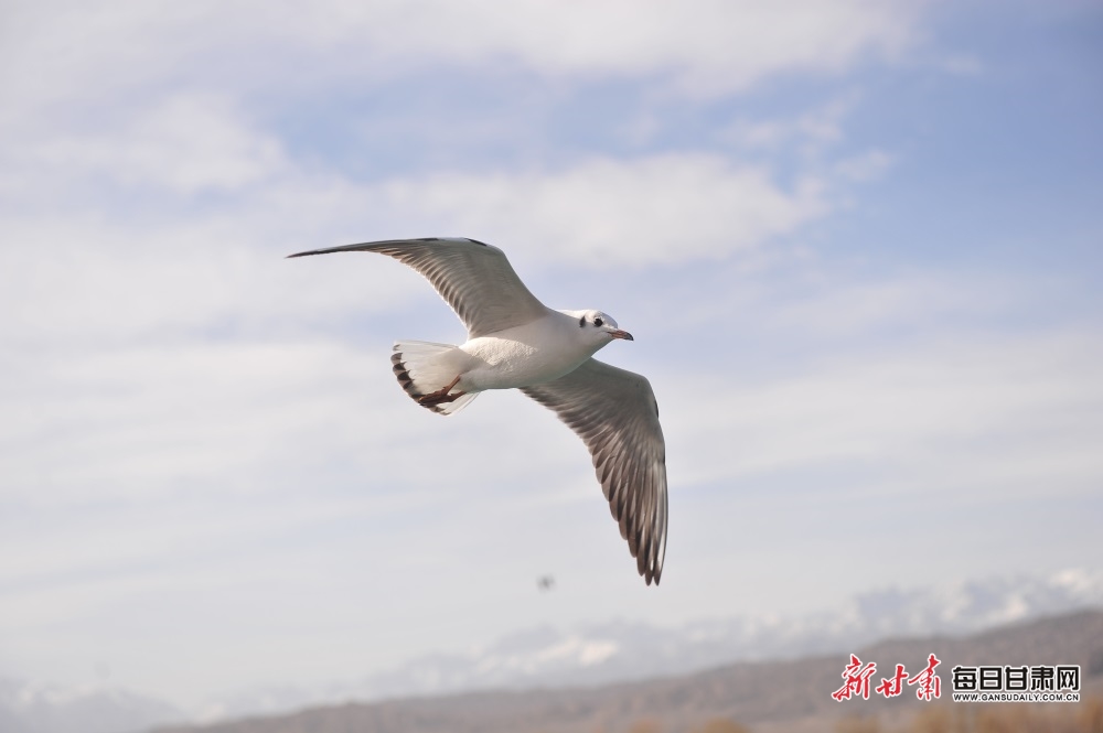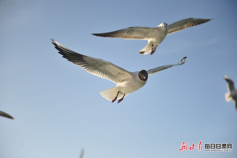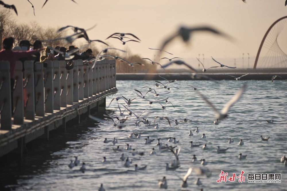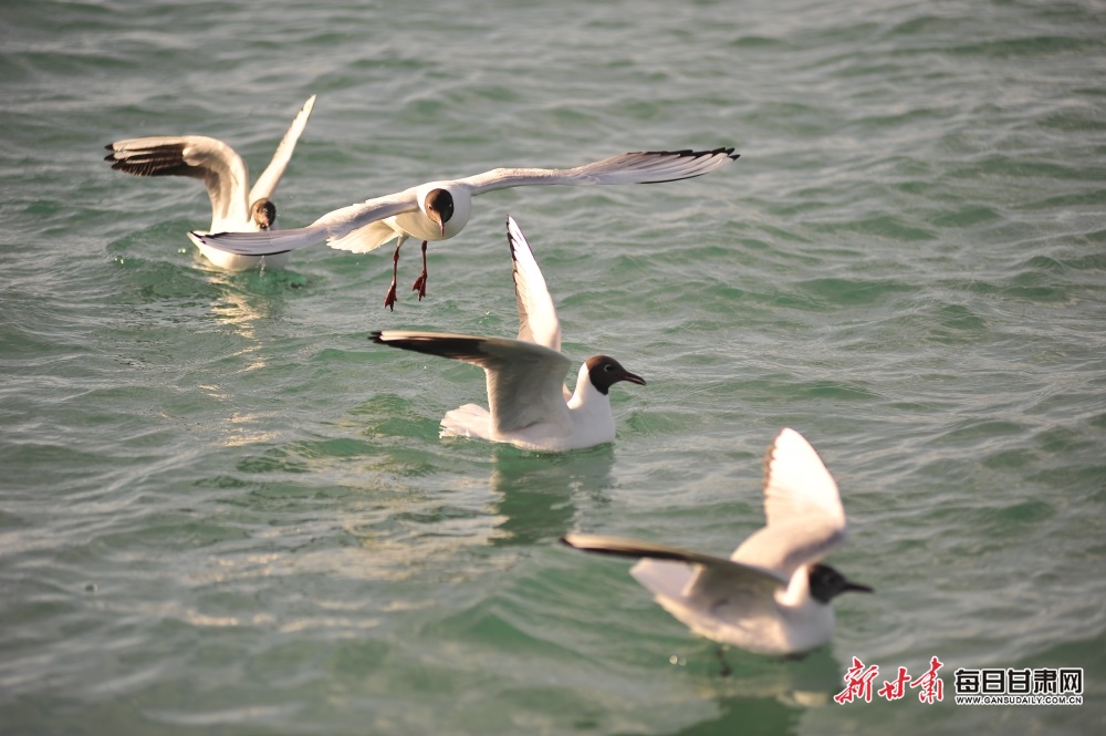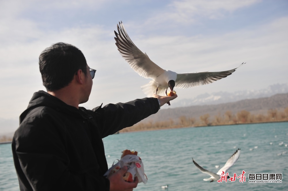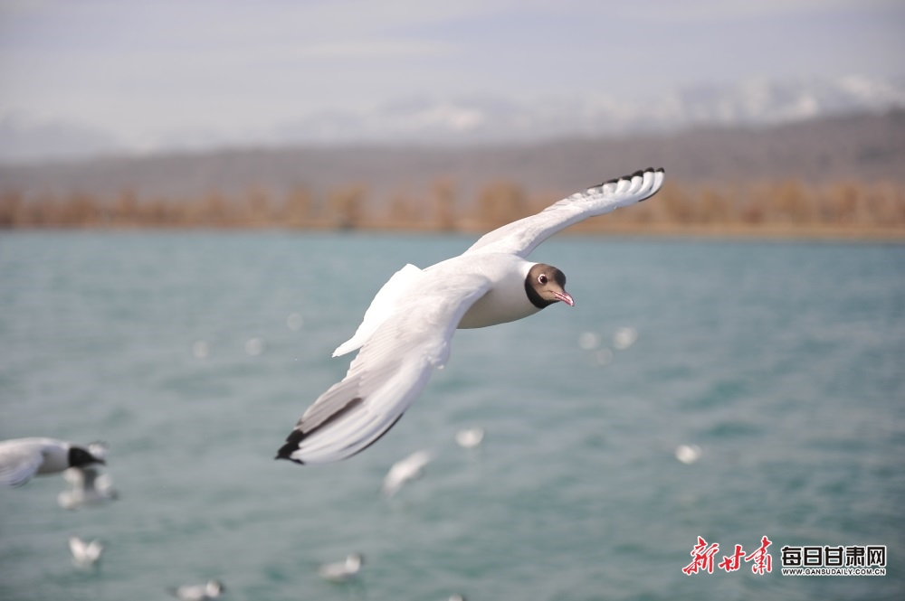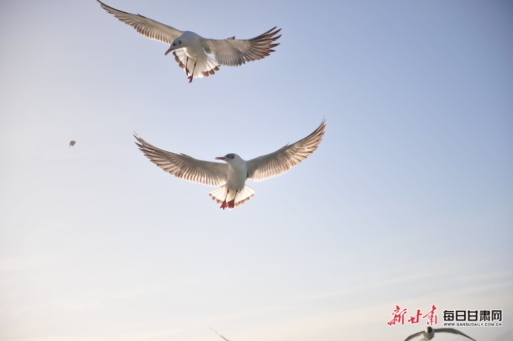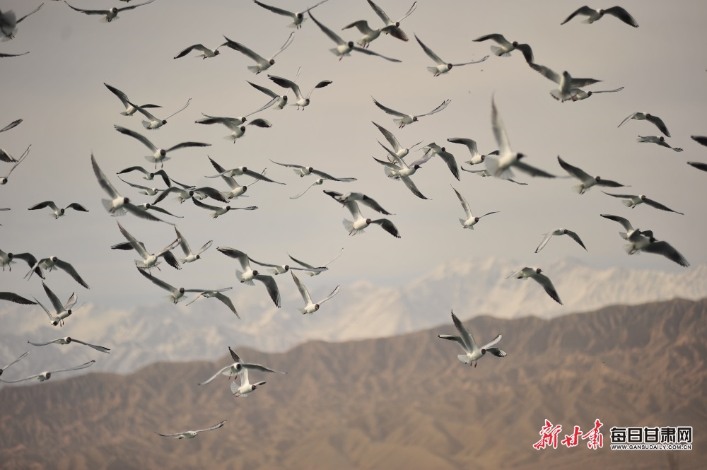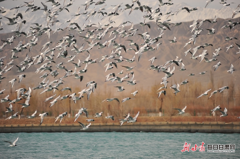清明时节,迁徙过境的上万只海鸥在嘉峪关市南湖讨赖河公园觅食、栖息、翱翔。