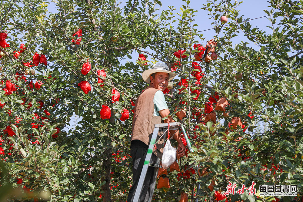 9月24日,走进秦安县五营镇绿野种植专业合作社苹果种植基地,成片的苹果园里硕果累累,工人们正忙着给苹果“脱袋”,每年这个时候都是果农们最期盼,也是最忙碌的时候。苹果采摘之前,都要经过脱袋增色这道必需的工序,果农们想尽办法扮靓果品,确保能有个好“颜色”、好“丰景”。同时,绿野种植专业合作社今年首次尝试种植的免套袋苹果长势喜人,果实表皮光滑、果味香甜,即将成熟上市。