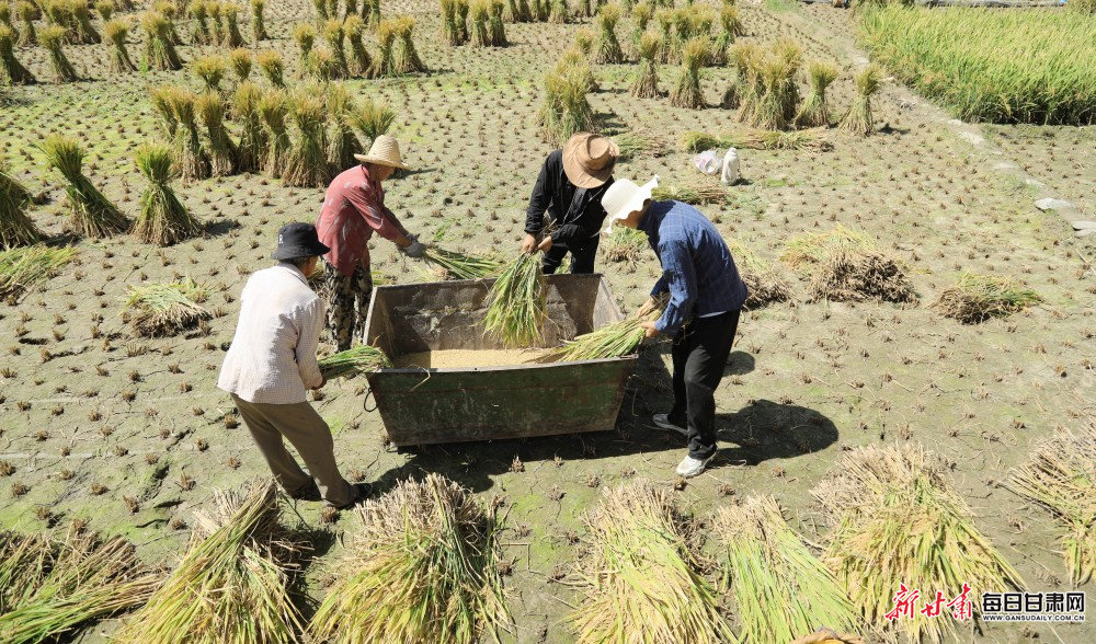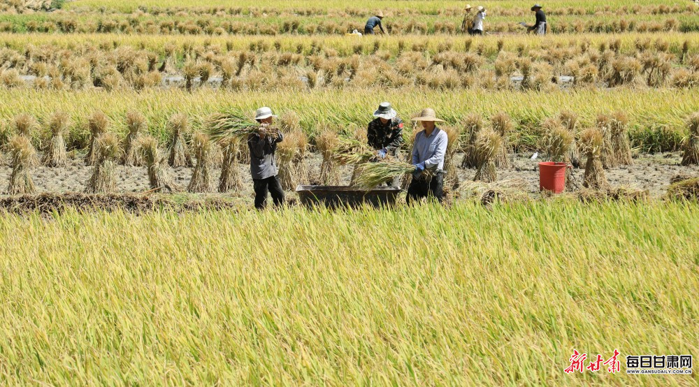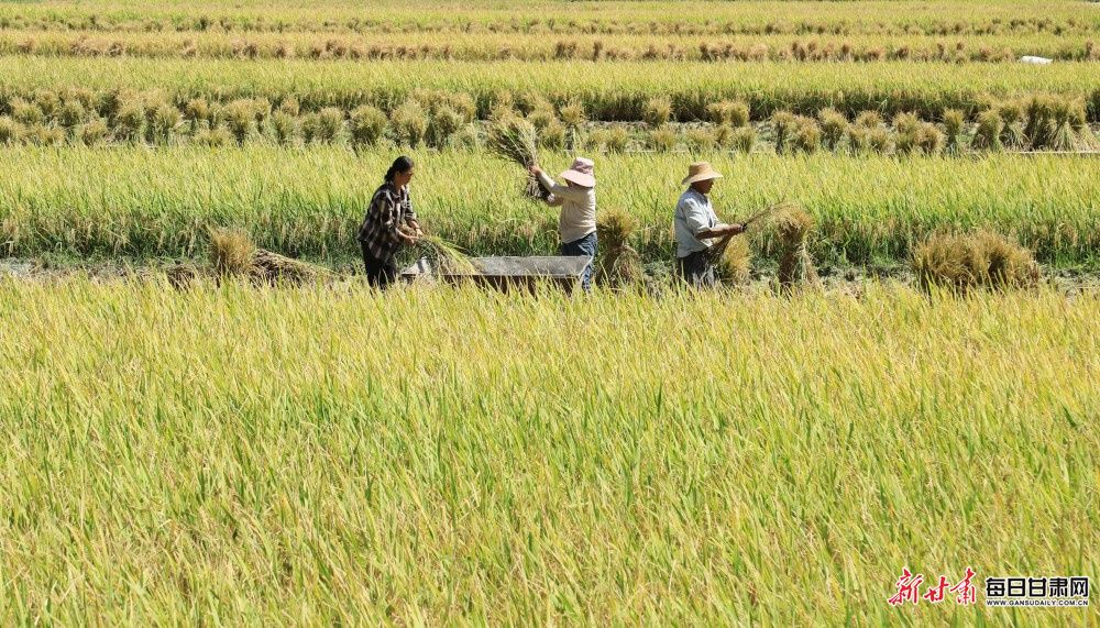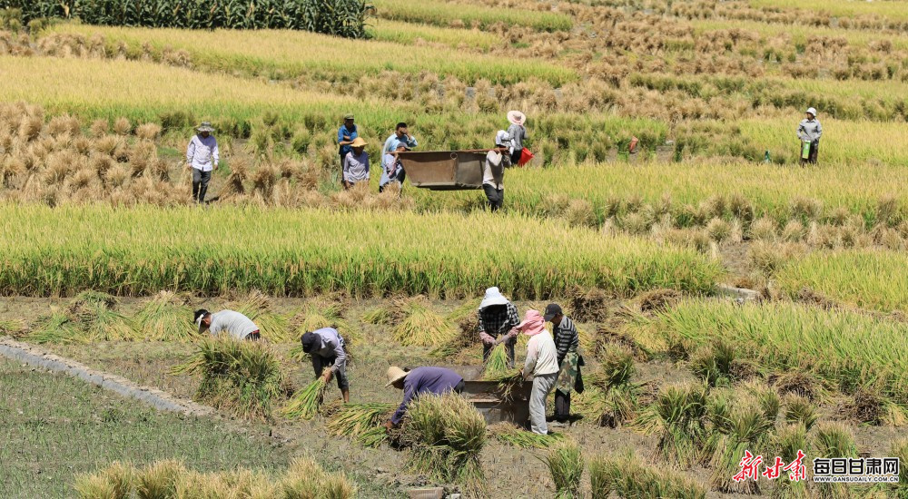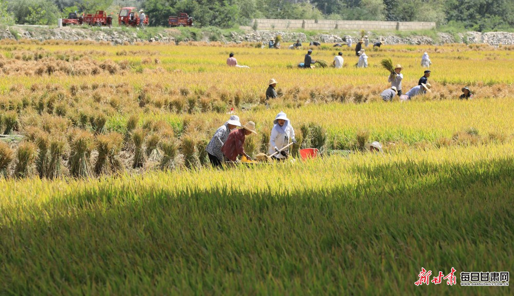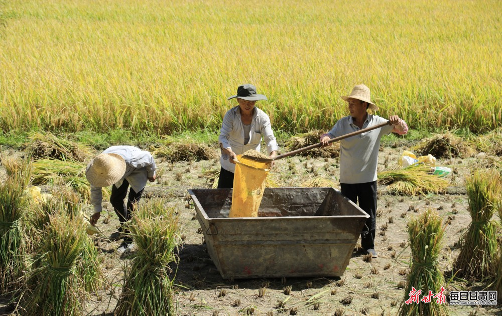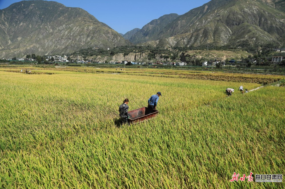 金秋九月,武都区石门镇草坝子村的“水旱两用”田里,金黄的稻穗压弯了秸秆,农户们挎着收割工具穿梭田间,弯腰、割稻、脱粒,一派丰收景象,饱满的稻谷被源源不断地装入粮袋,即将颗粒归仓。