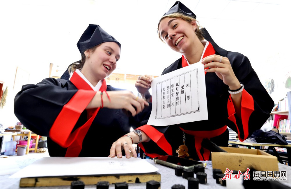 活动中,留学生们身着传统汉服,先学习木活字印刷的拜师礼,再在指导老师的带领下,一步步完成字库选字、挑选字模、涂抹墨汁、覆纸刷压等工艺。当一首首中国古诗词通过自己的双手跃然纸上,留学生们纷纷捧着作品相互展示,脸上满是喜悦。这场“行走的课堂”,不仅让他们亲手触摸到活字印刷的技艺,更真切感受到了中国非物质文化遗产的独特魅力。