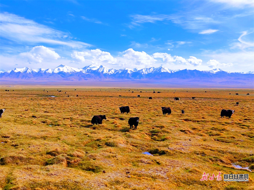 远处,皑皑雪山如圣洁的背景板矗立天际,与脚下的金色草原形成鲜明而和谐的色彩碰撞。藏原羚、野牦牛等野生动物不时在草原上漫步、觅食,灵动身影与自然景致相映成趣,勾勒出一幅兼具生态之美与野趣之韵的秋日图景,让肃北的秋更显鲜活动人。