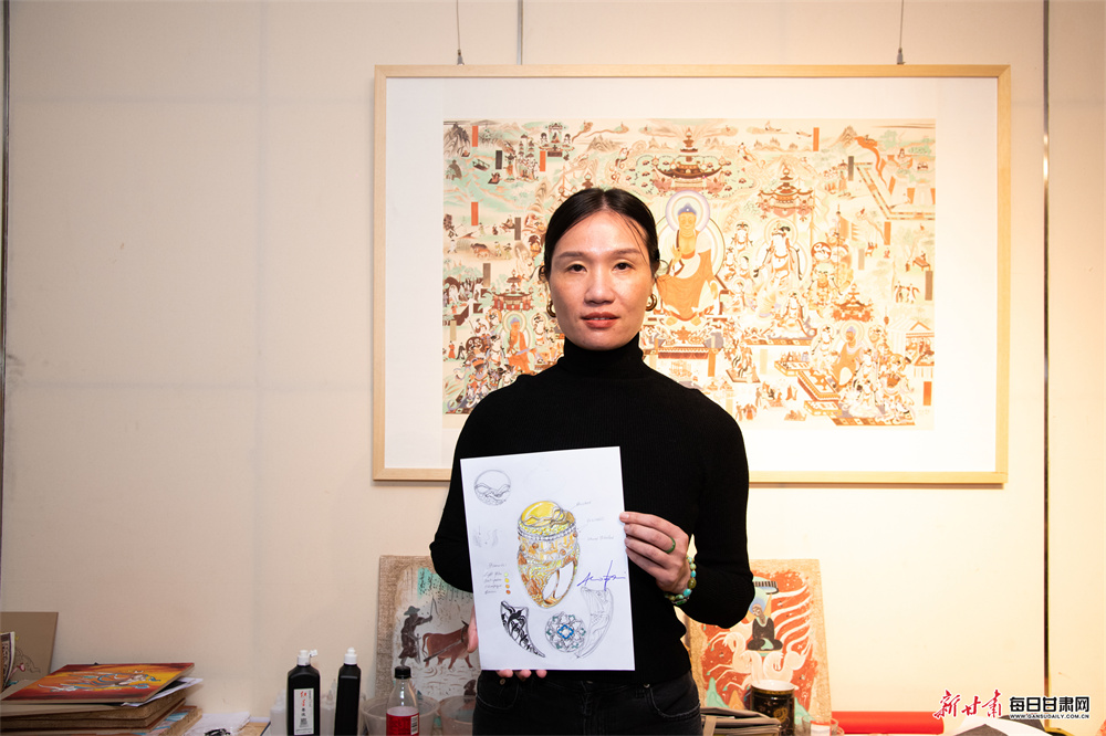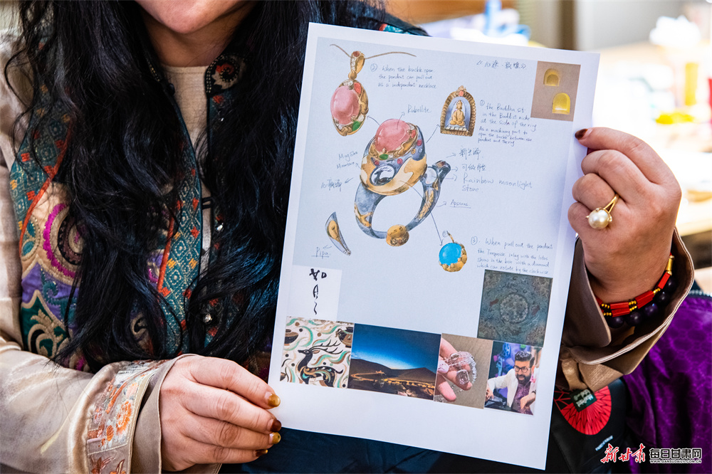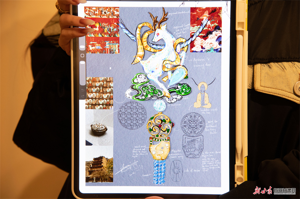 课堂上,Alessio Boschi以敦煌壁画为创意原点,亲手示范设计转化全过程:从壁画中提取飞天飘带的灵动曲线,化作吊坠的流畅轮廓;将藻井纹样的对称美学,融入界面的细节雕琢;借鉴壁画矿物颜料的浓郁色彩,搭配红蓝宝、青金石等宝石,让每一笔设计都承载敦煌文化的厚重底蕴。他边绘制草图边讲解:“敦煌壁画里的每一处线条、每一种色彩,都是历经千年沉淀的艺术密码,把这些密码融入珠宝,能让首饰成为‘可佩戴的丝路故事’。”