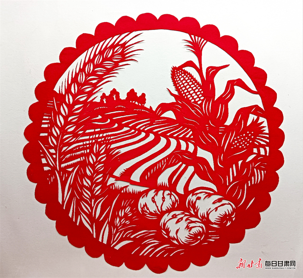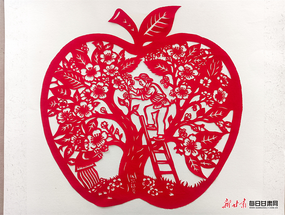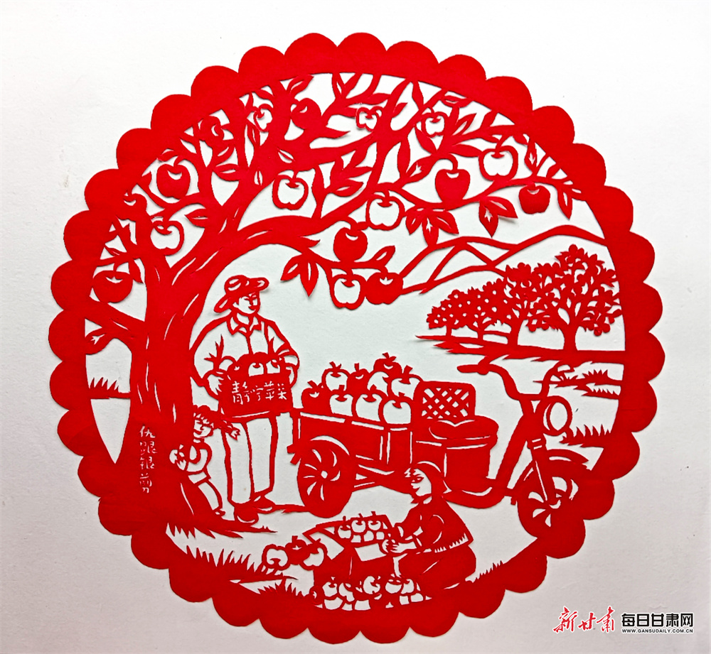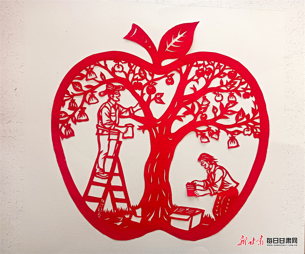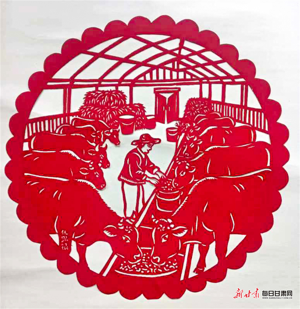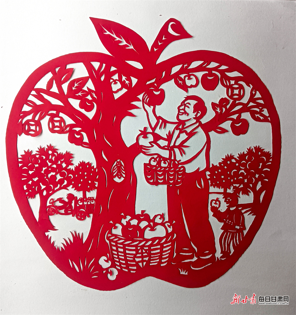 这幅作品里,每一个元素都是静宁乡村发展的生动注脚:享誉在外的静宁苹果是农民的“致富果”,膘肥体壮的平凉红牛是特色养殖的“金名片”,麦穗、玉米则承载着粮食安全的底气。仇跟银以非遗技艺为笔,以红纸为卷,不仅让传统剪纸“活”在了当下,更将新时代“农业强、农村美、农民富”的美好生活图景定格成了可触摸、可欣赏的文化符号,让乡村振兴的喜悦顺着剪纸的纹路,传到了更多人心中。