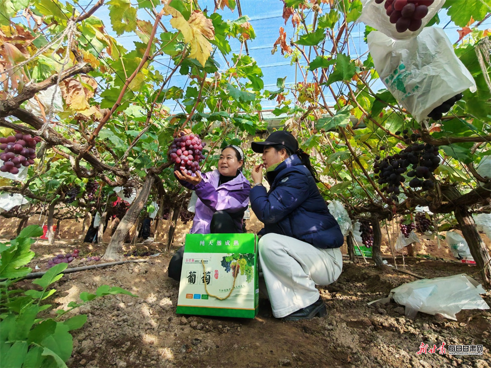 初冬时节,走进山丹县大马营镇花寨村的红提葡萄种植大棚,一股清新的果香扑面而来。棚内,一串串饱满圆润、色泽鲜亮的葡萄挂满藤蔓,如珍珠、似玛瑙,散发着诱人的光泽。