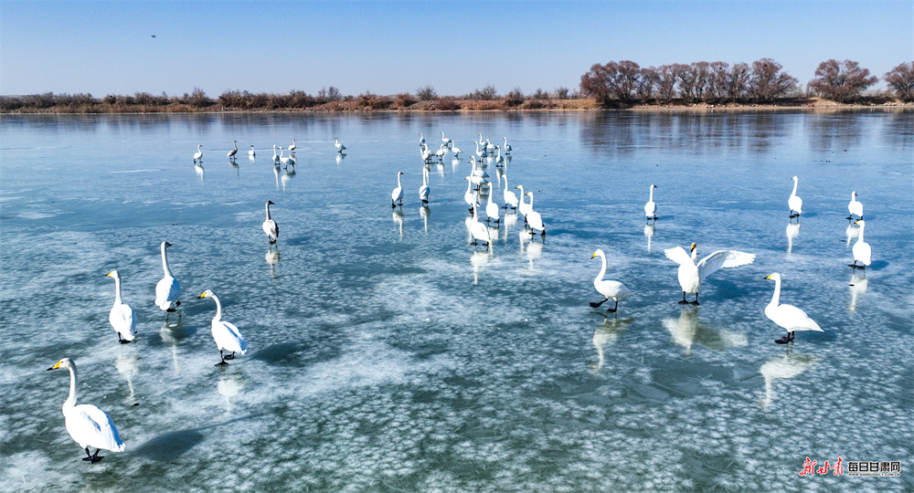 初冬时节,酒泉市金塔县芨芨水库湿地生机盎然。成群结队的白天鹅、赤麻鸭展翅翱翔于澄澈湖面,或嬉戏游弋,或梳理羽翅,灵动身影与湿地风光相映成趣,构成一幅韵味十足的初冬生态图景。
