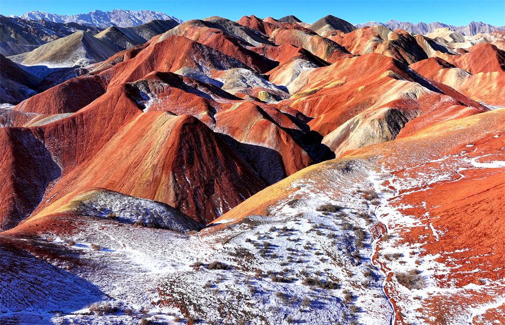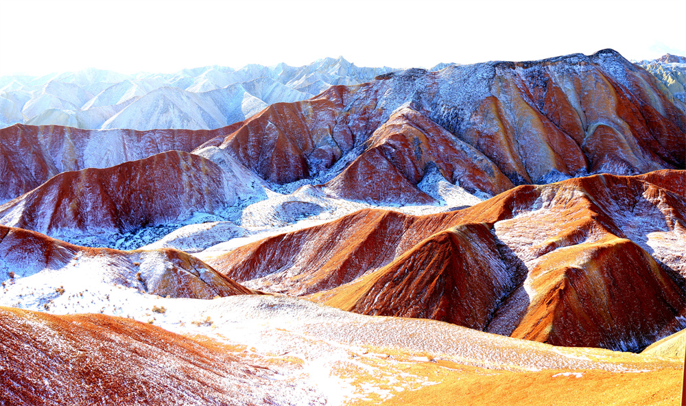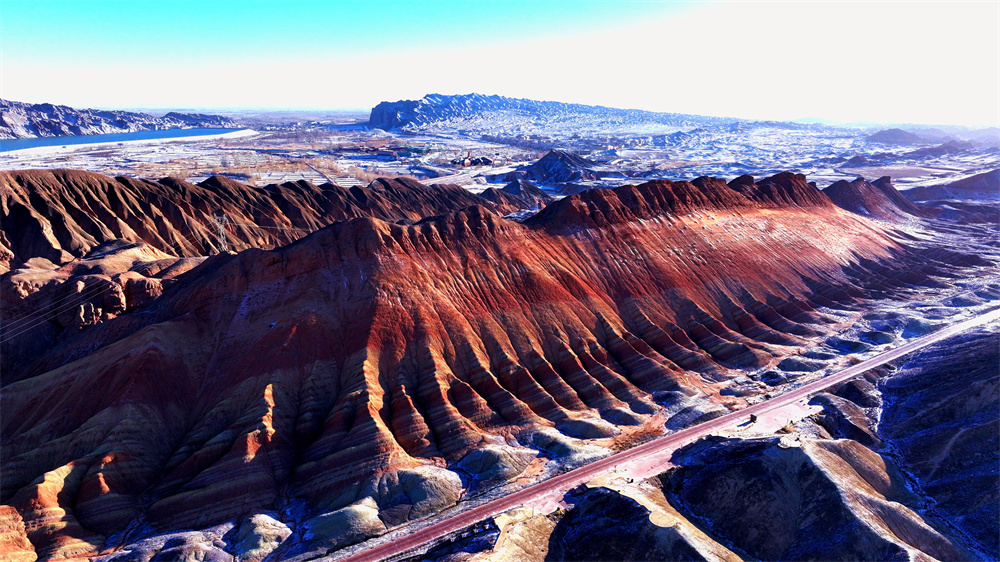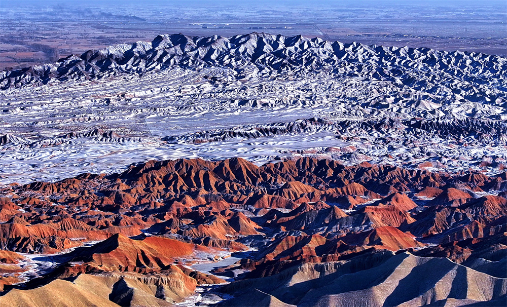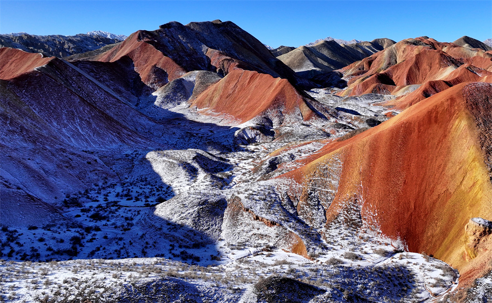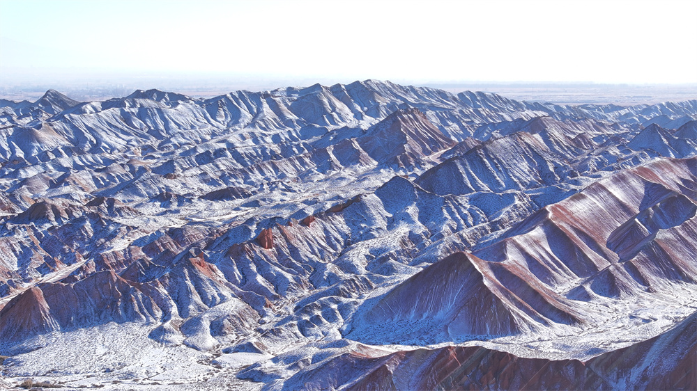 登高远眺,连绵丹霞在雪色中尽显柔美。雪线沿山势精准描摹,阳坡处斑斓岩层倔强展露本色,背阴面新雪为峰峦缀上晶莹冠冕。沟壑间,雪花与矿物岩层交融,造就平日难及的光影层次与色彩韵律。这场初雪为河西走廊增添浪漫,也让丹霞在四季轮回中绽放出最典雅的冬日韵味。