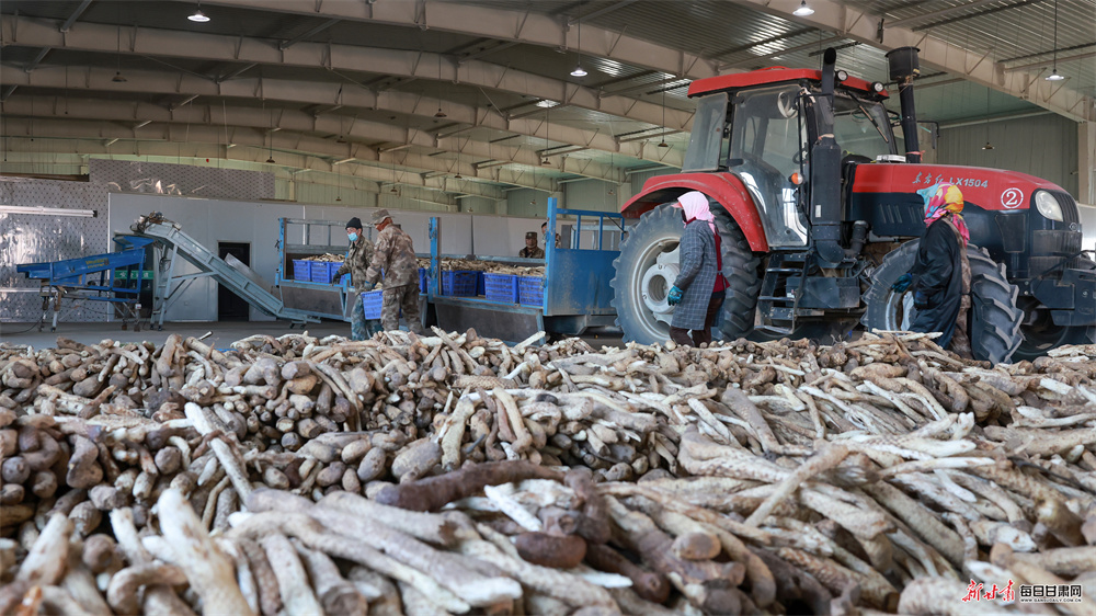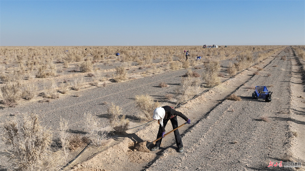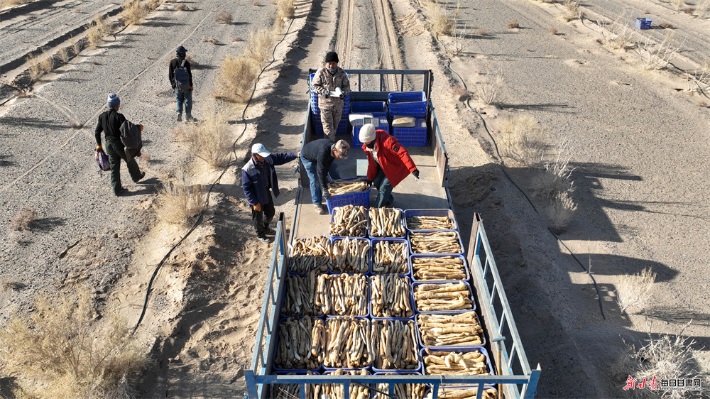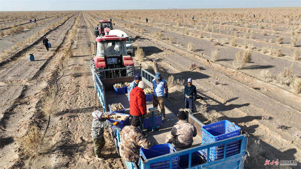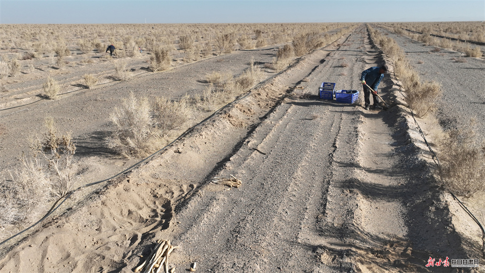 11月20日,位于巴丹吉林沙漠边缘的酒泉市金塔县大漠农林生态产业股份公司万亩梭梭种植基地,工人忙着采挖、分拣、加工中药材肉苁蓉,一派繁忙景象。