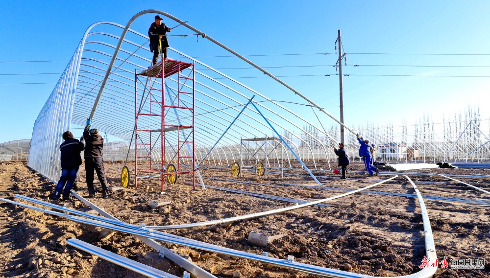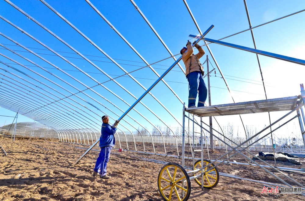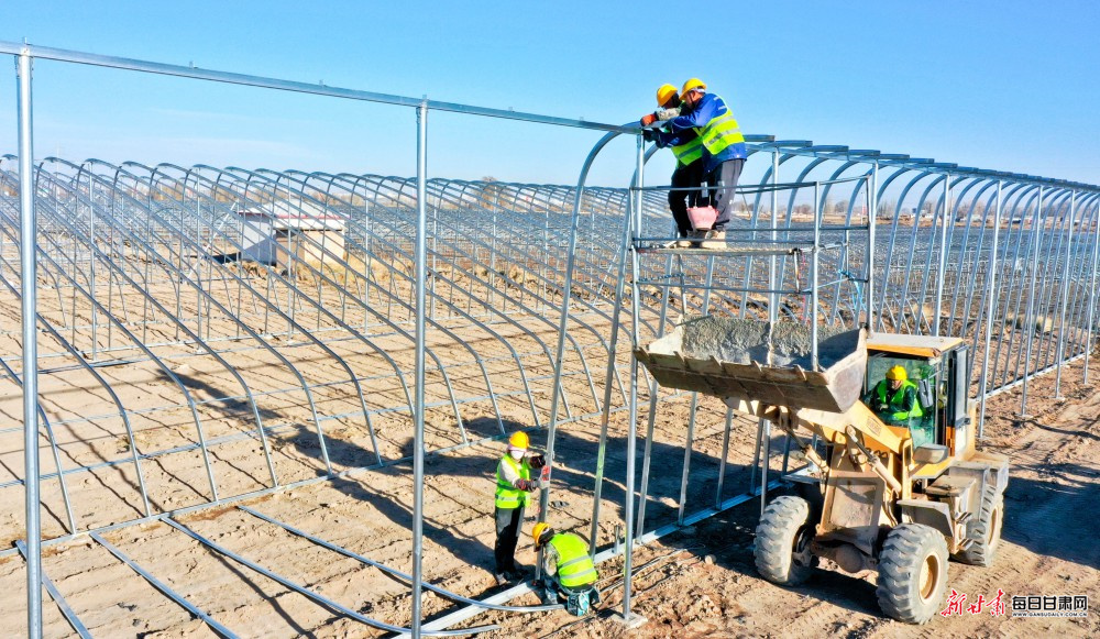 11月27日,张掖市高台县巷道镇红联村设施蔬菜产业基地内,工程建设者顶着零下十几摄氏度的严寒,全力推进日光温室棚体焊接、固定等施工工序,现场一派繁忙景象。