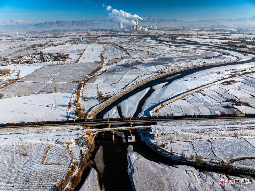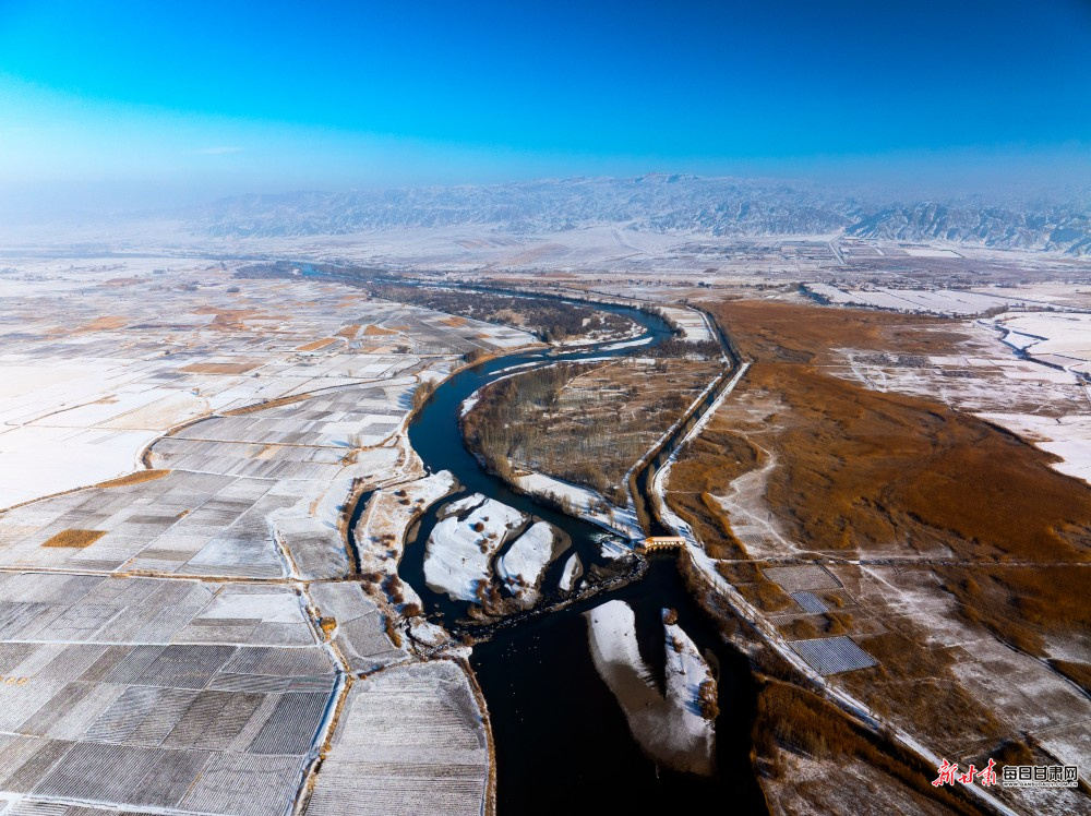 岁末冬深,河西走廊腹地的黑河两岸迎来今冬第二场大范围降雪。12月20日,航拍视角下的黑河宛如一条澄澈蓝丝带,蜿蜒穿梭于银白沃野与浅褐湿地之间,雪裹沙洲、霜覆田畴的景致,将西北冬日的苍茫雄浑与灵动秀美尽数糅合。