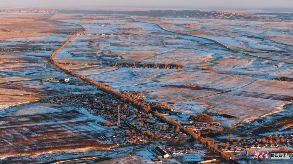山脚下的村落裹着一层薄雪,与橙黄的田畴、墨色的林带错落分布于开阔河谷,旧年的麦垛在暖阳下泛着温软的光泽。曾经驼铃叮当的千年古道沿线,积雪半掩苍茫旷野,历史的厚重与冬日的诗意在此相融,尽显丝路廊道独有的冬日美景。