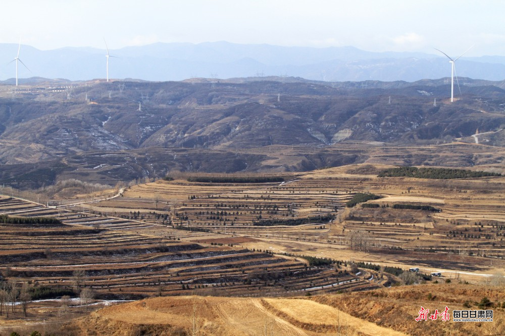 层层叠叠的梯田似大地镌刻的年轮,顺着山势蜿蜒舒展。枯黄的田垄与深褐的土壤交织错落,勾勒出质朴厚重的肌理,为苍茫山野平添了几分烟火韵味。山脊之上,一座座风力发电机擎天而立,银白机身在澄澈天光下熠熠生辉,巨大扇叶随山风缓缓转动,既是山野间灵动的风景线,更承载着绿色发展的动能,让生态与发展的相融之美在群山间悄然绽放。