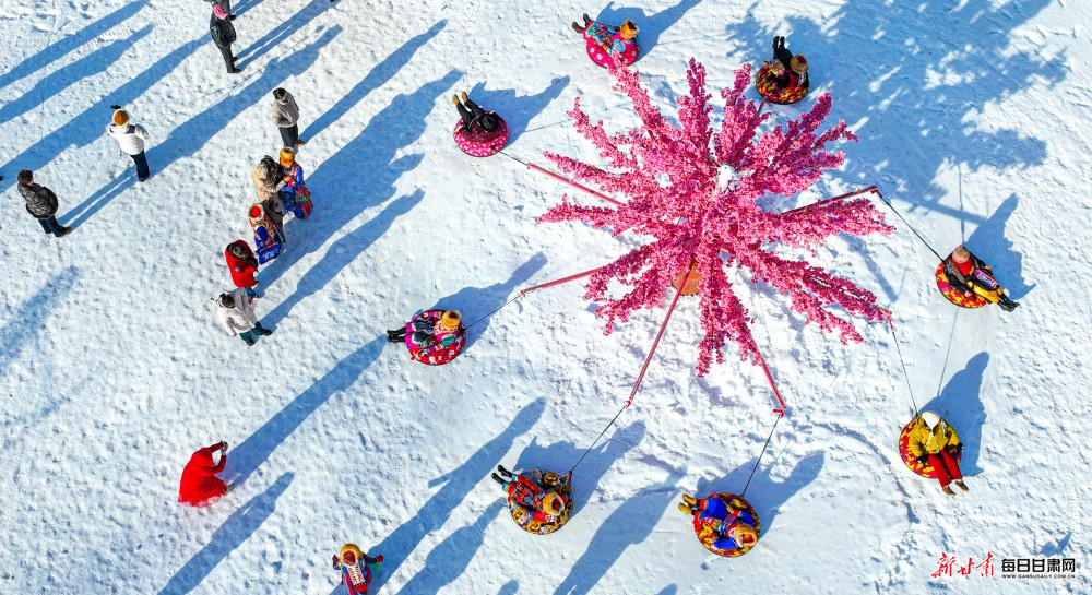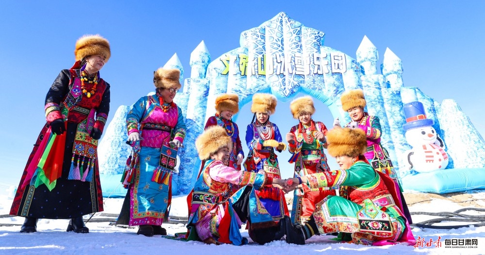 12月29日,皑皑白雪覆盖下的张掖市肃南裕固族自治县祁丰藏族乡东纳藏乡小镇冰雪乐园热闹非凡,当地村民与八方游客手拉手跳起欢快的锅庄舞,歌声与笑声交织,共迎2026年的到来。