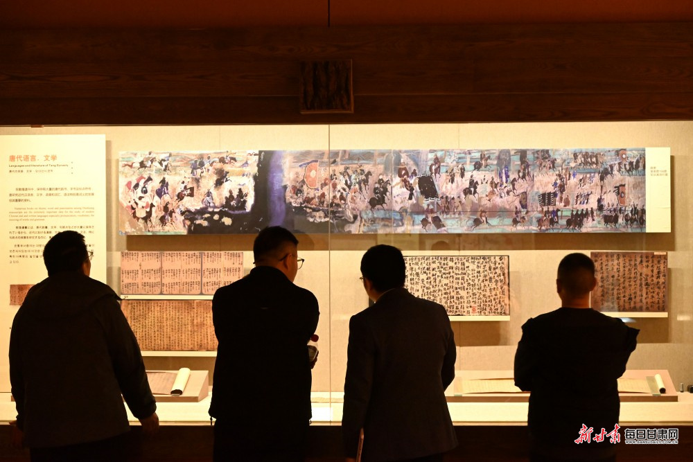 游客在观赏晚唐莫高窟156窟张议潮出行图。