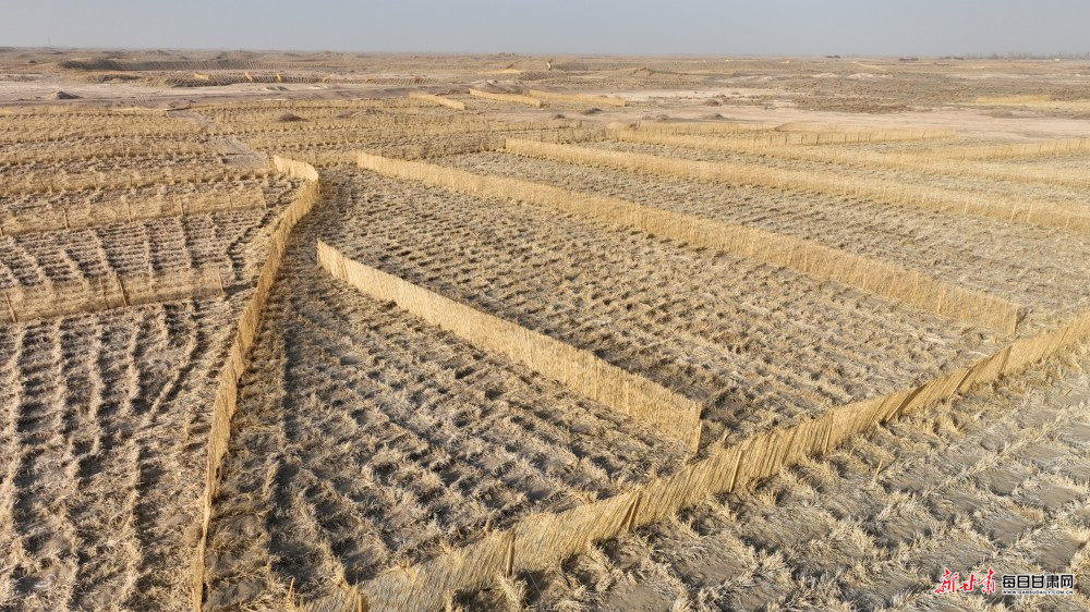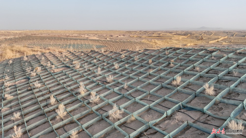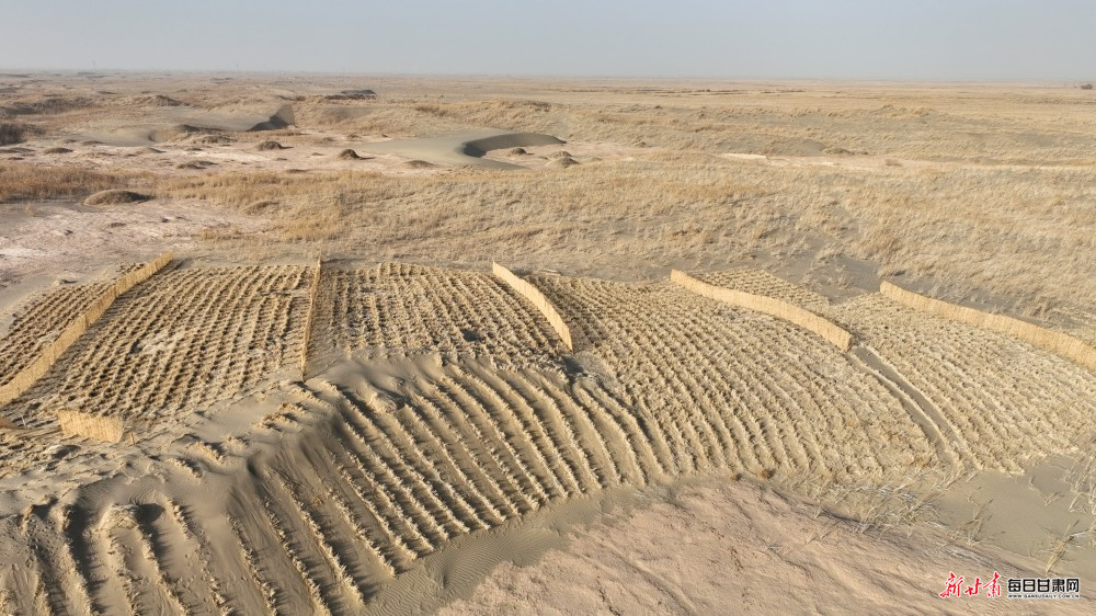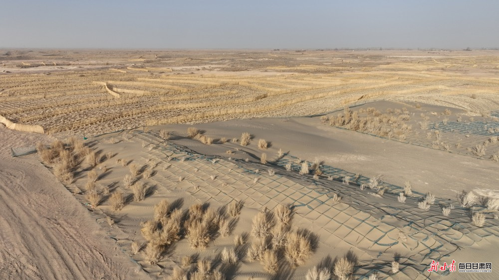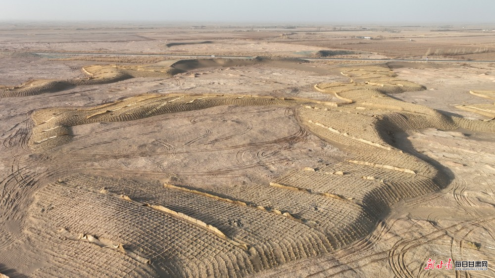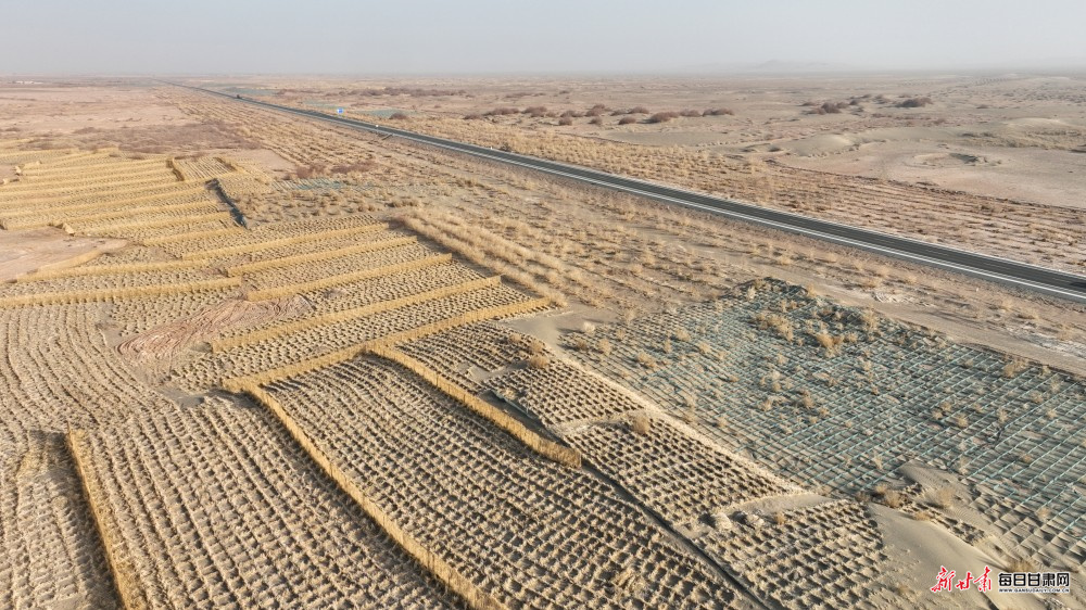 1月22日,在酒泉市金塔至大墩门公路两侧连绵起伏的沙丘上,千亩阻沙网与草方格交织成一道道“沙海防线”,昔日随风移动的沙丘被牢牢锁住。