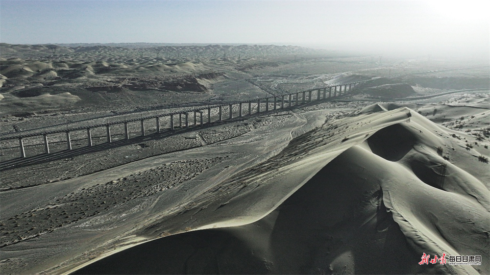 在酒泉市阿克塞哈萨克族自治县,库姆塔格沙漠的热浪裹挟着沙粒终年盘旋。一座全长10.6公里的沙山沟特大桥如银色巨龙横亘金色沙海,作为敦格铁路的咽喉要道,它不仅是中国唯一穿越活动性沙漠的特大型桥梁,更是串联东西、贯通南北的“钢铁动脉”,承载着西北与青藏地区物资运输、人员往来的重要使命。