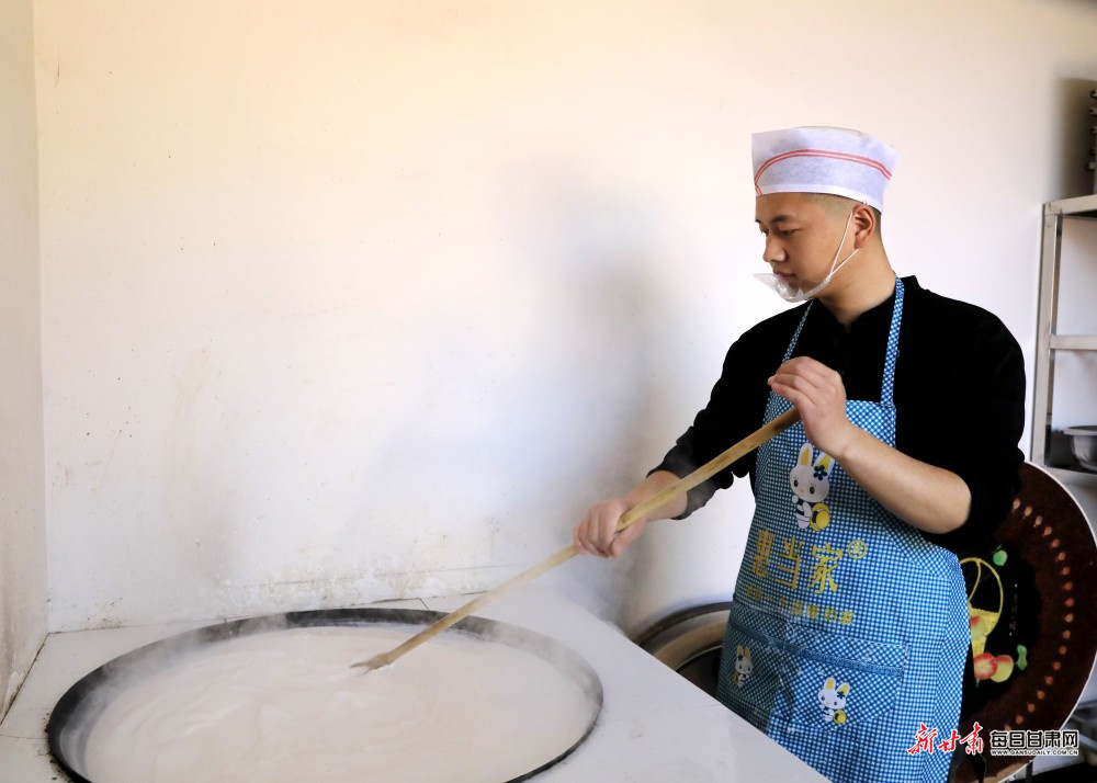 从最初的生疏到如今的游刃有余,王有志在灶台上练就了“真功夫”。他坚持纯手工制作,拒绝添加剂,每一道工序都精益求精。功夫不负有心人,他的荞凉粉以爽滑的口感和浓郁的荞香迅速征服了食客味蕾,不仅在集市上“圈粉”无数,更创下了日销20余盆的佳绩,成为当地名副其实的“网红小吃”。