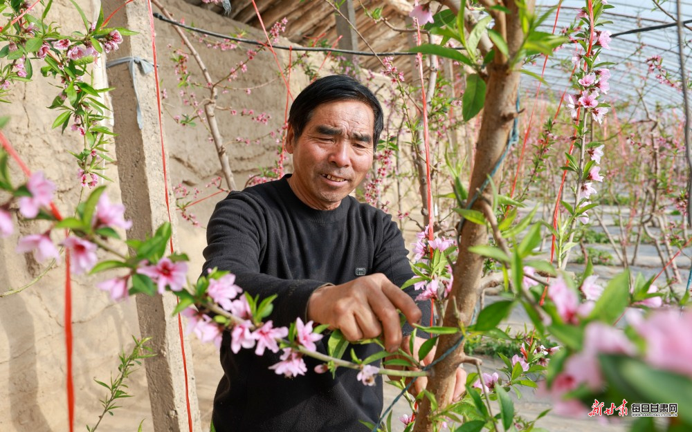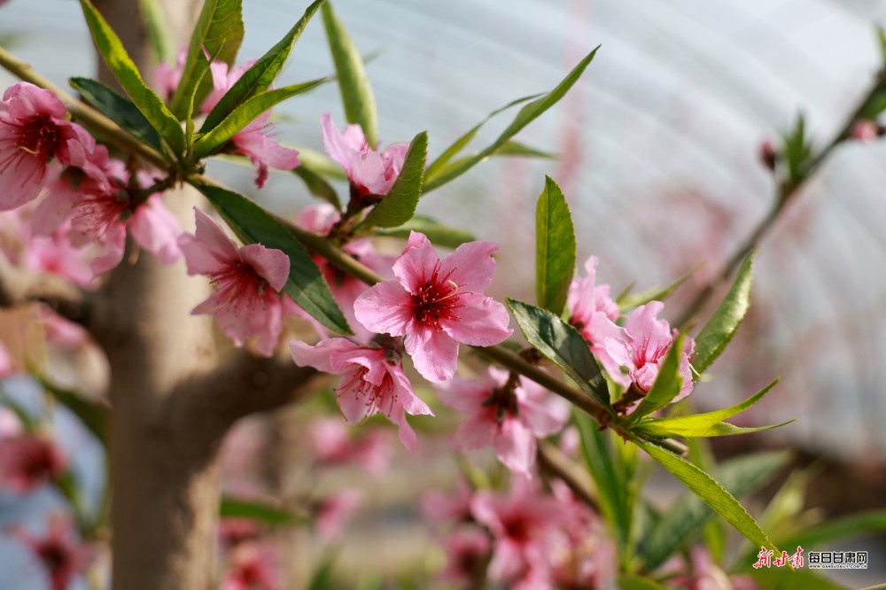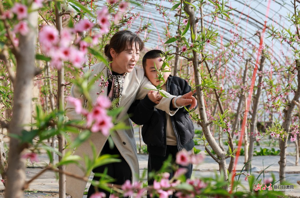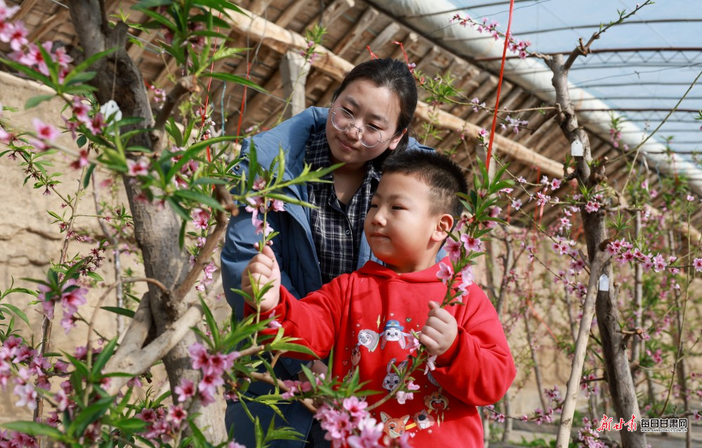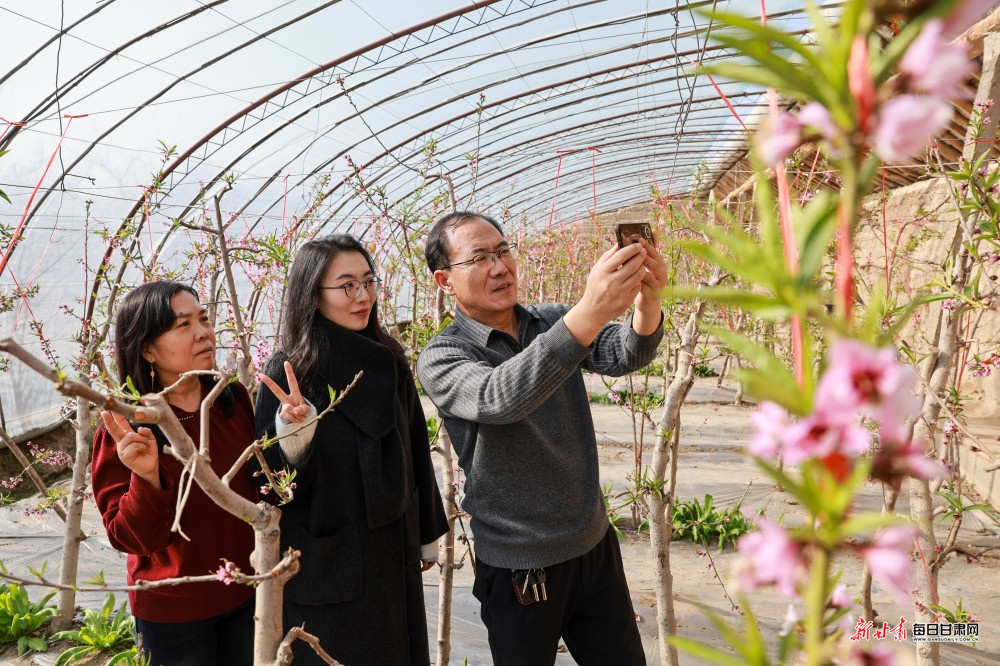 立春时节,酒泉市金塔县金塔镇金大村的温室大棚里暖意融融,朵朵桃花迎春绽放,吸引不少游客前来赏花拍照,提前感受春日气息。