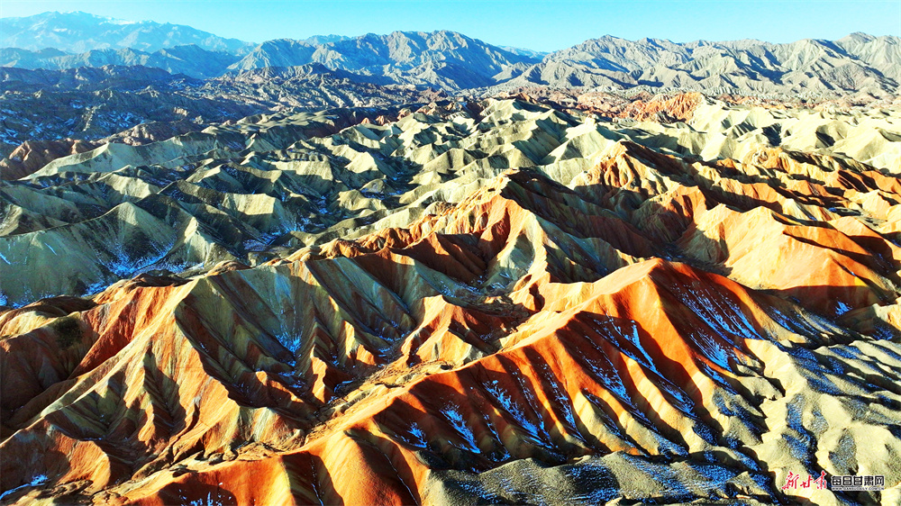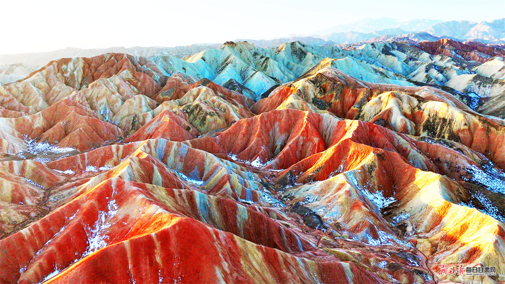 立春时节,张掖七彩丹霞原本浓艳的赤红更显炽烈,明黄愈发鲜亮,与青灰、墨黑的岩壁交相辉映,碰撞出“冰与火”交织的奇幻意境。
