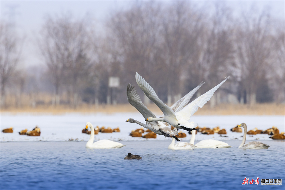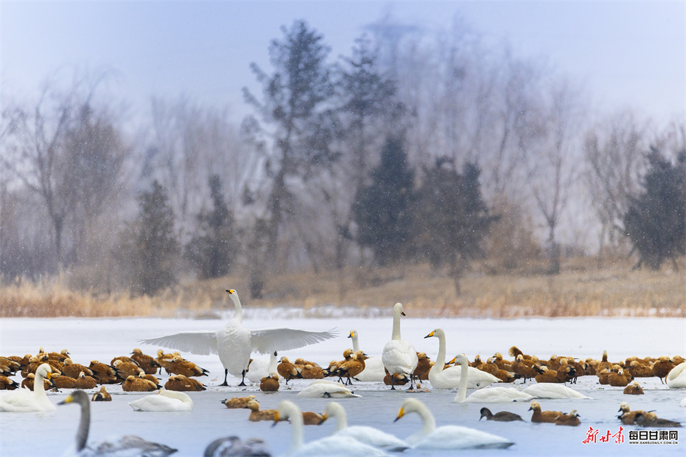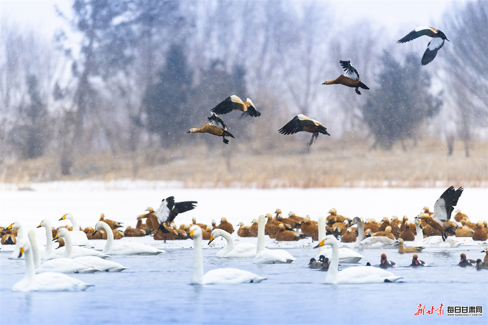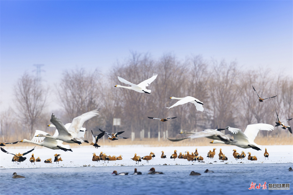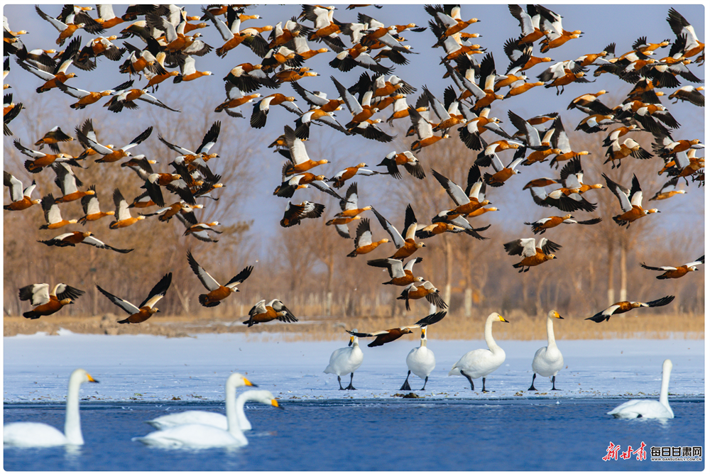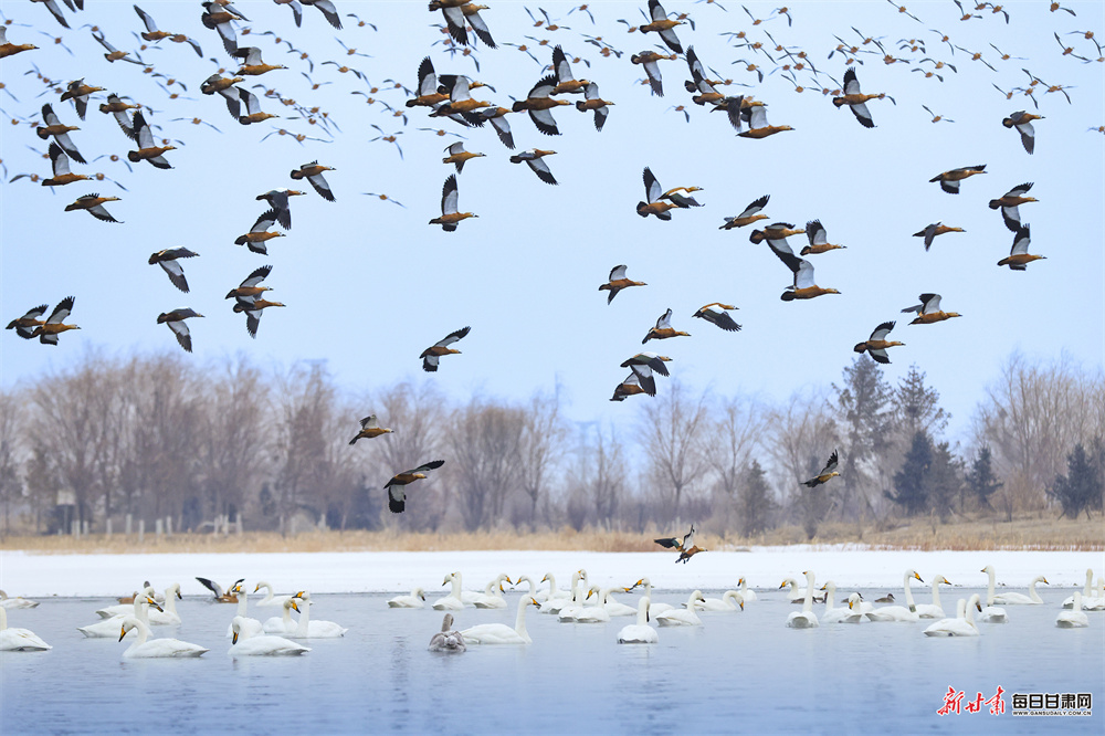 立春时节,张掖国家湿地公园冰雪消融、水暖初醒,天鹅、赤麻鸭等鸟类齐聚栖息,呈现万鸟齐飞的生态盛景。