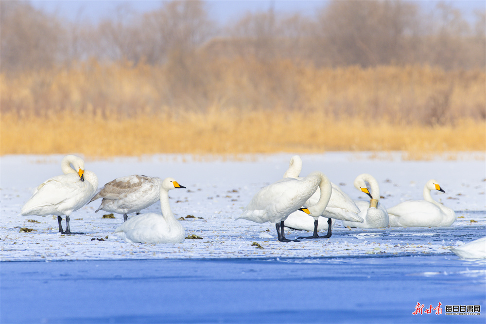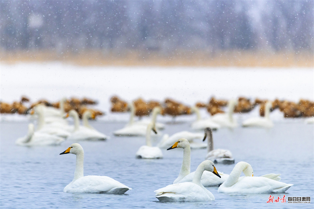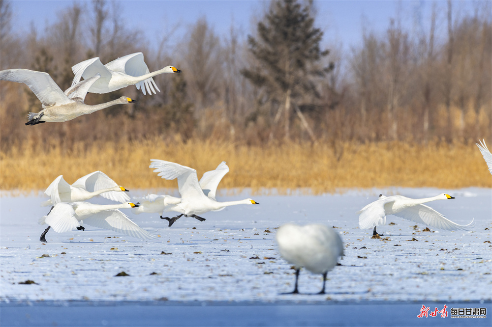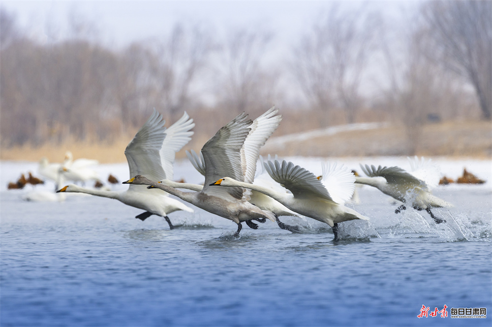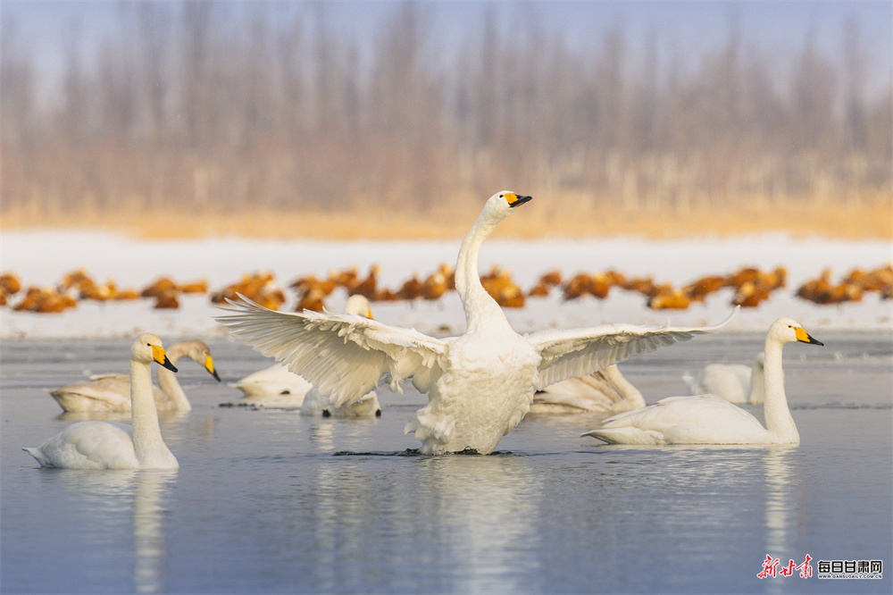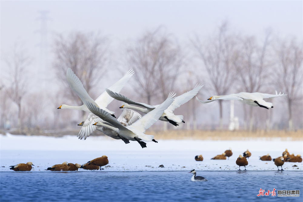 立春时节,张掖国家湿地公园冰雪消融、水暖初醒,天鹅、赤麻鸭等鸟类齐聚栖息,呈现万鸟齐飞的生态盛景。