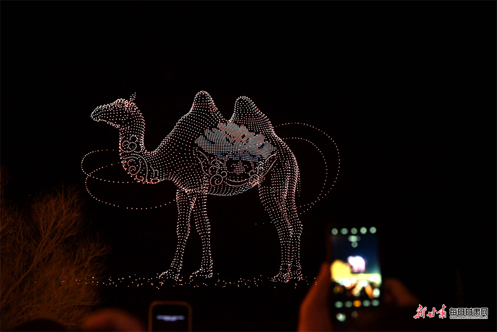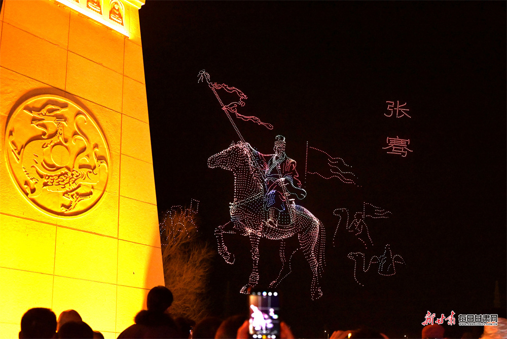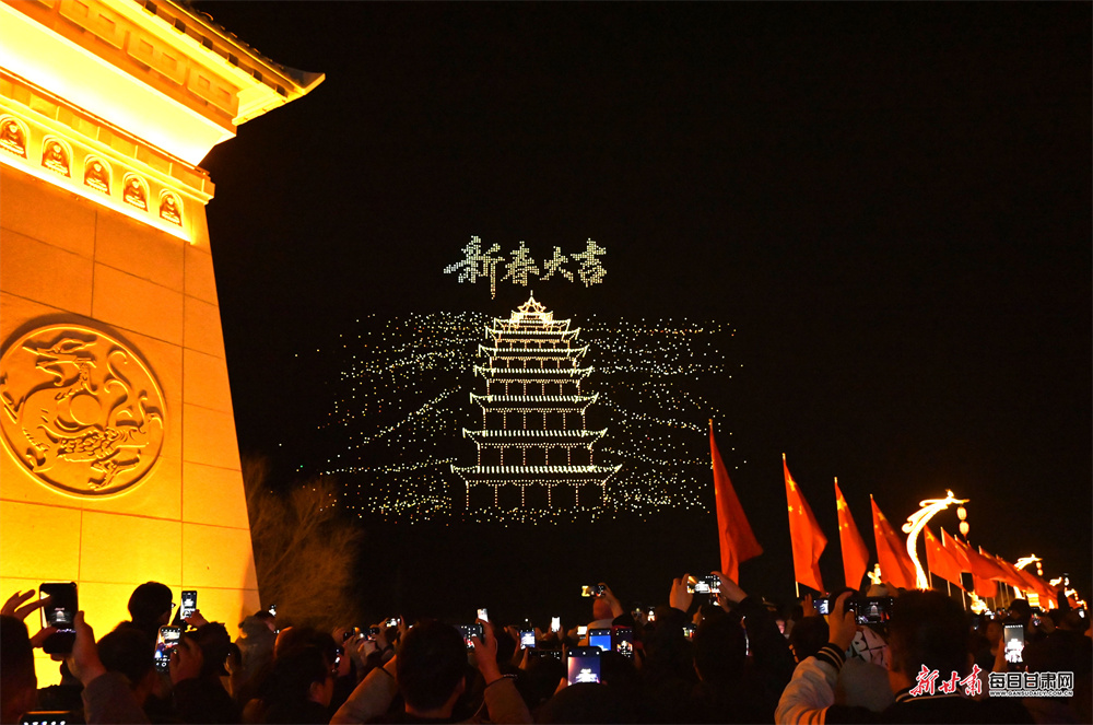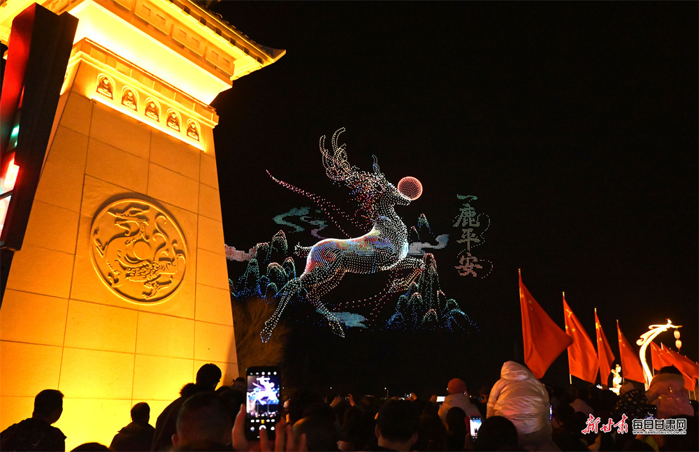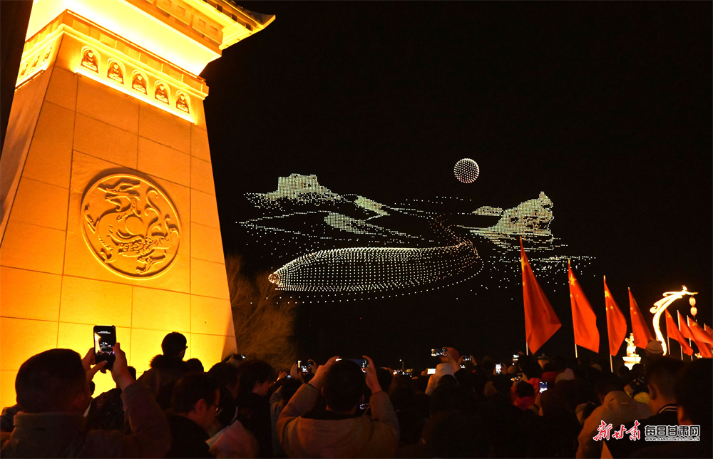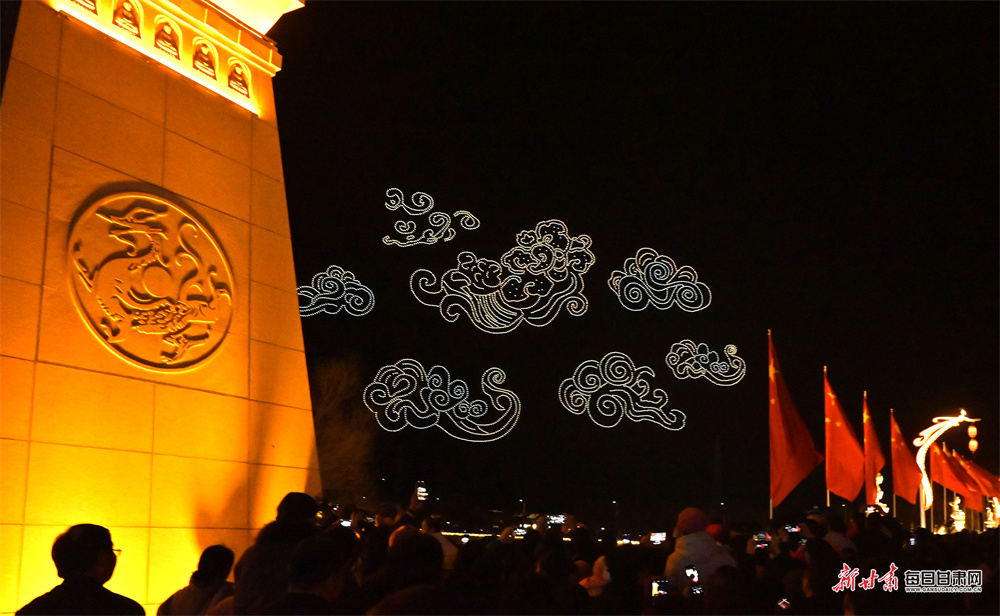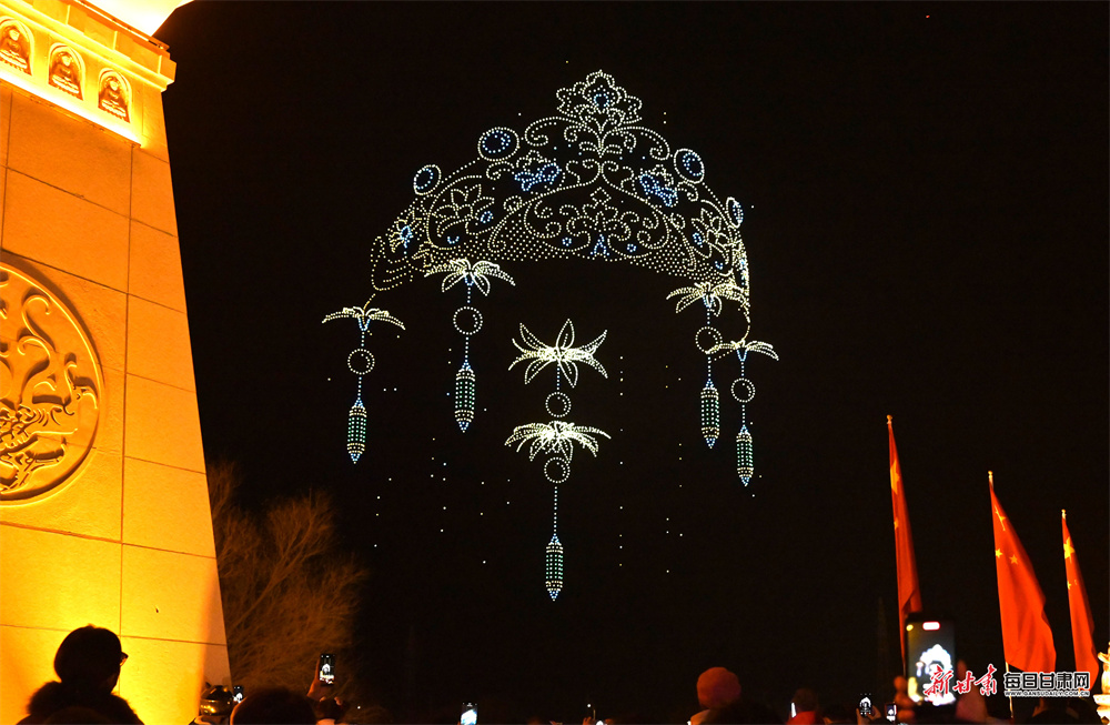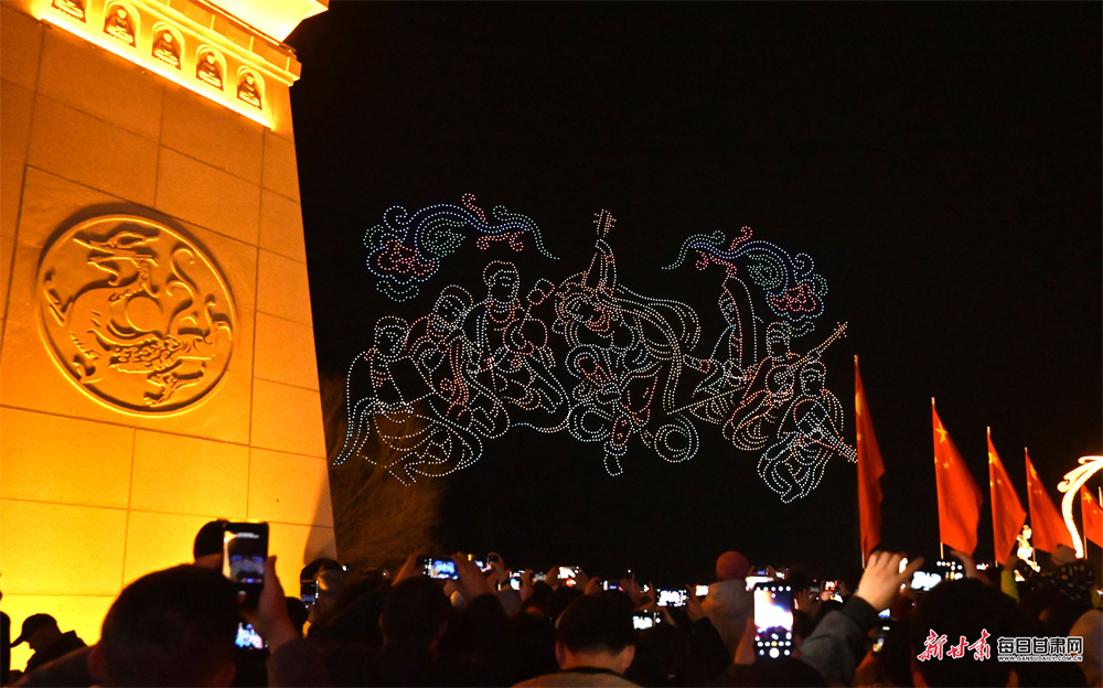 夜空为幕,光影传情;千年敦煌,焕发新章。2月22日晚,敦煌市党河风情线灯火璀璨、人流涌动,万架无人机腾空而起、编队翱翔,一场以“科技与文明交辉,敦煌与世界对话”为主题的无人机光影秀惊艳上演,用科技之光勾勒敦煌文脉,让千年壁画在夜空之上徐徐“绽放”。