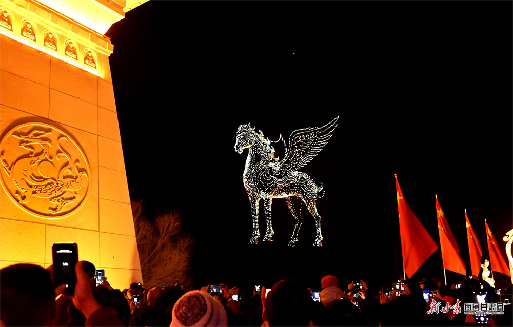 此次无人机光影秀以敦煌文化为核心脉络,以浩瀚夜空为天然画布,以璀璨光影为灵动笔触,将莫高窟千年壁画、九色鹿、祥云纹样、翼马等经典敦煌文化符号,与高铁等新时代发展元素巧妙融合、无缝衔接。夜空中,无人机编队不断变换造型,时而化作灵动的九色鹿踏云而来,时而勾勒出莫高窟壁画的精妙线条,时而呈现翼马驰骋古丝路的壮阔景象,时而切换为高铁飞驰的现代图景,古老文明与现代科技跨越时空交相辉映,每一幕都令人震撼不已。