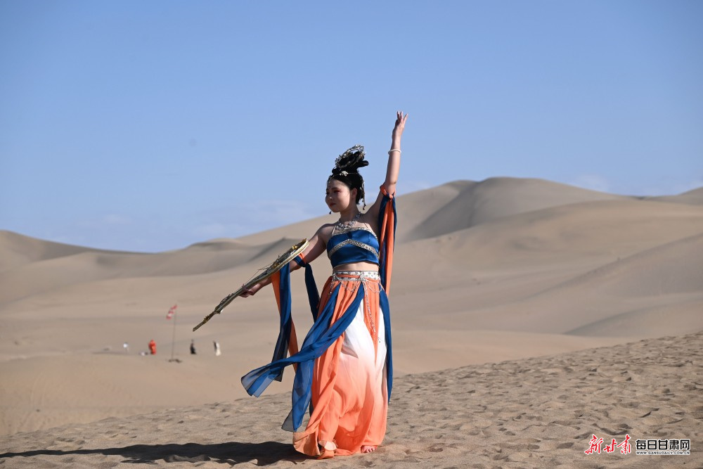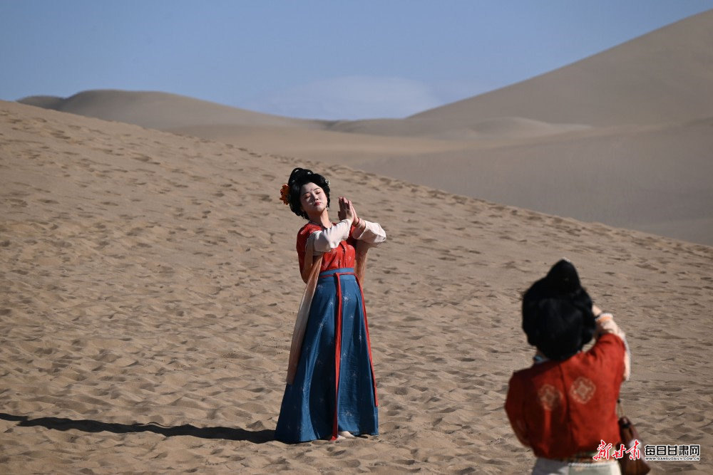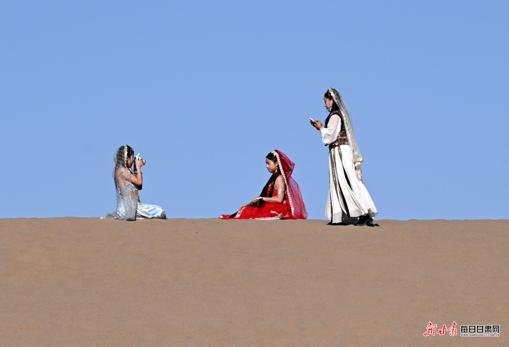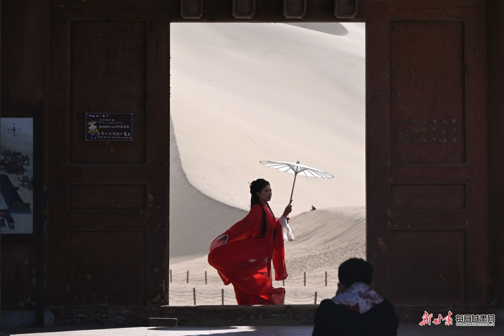 春日的敦煌沙海如画,游客们骑着骆驼穿行于沙峰之间,尽情领略大漠与清泉相依的独特景致,在轻松惬意的旅程中放松身心、定格美好瞬间,为景区增添了一抹亮丽的巾帼风采。