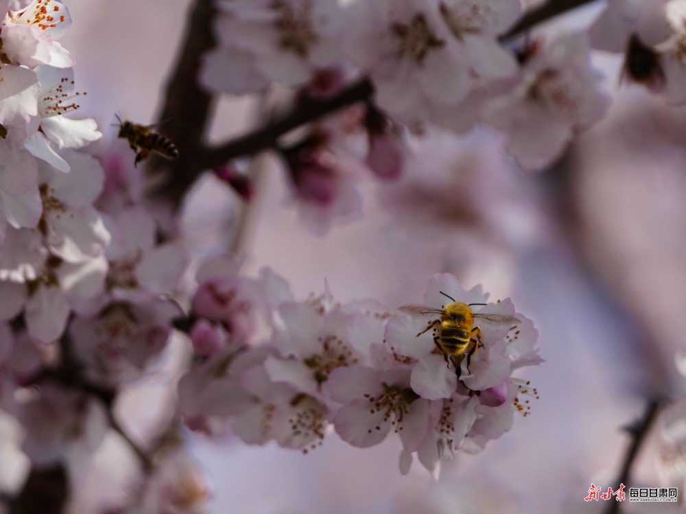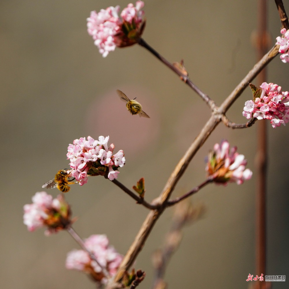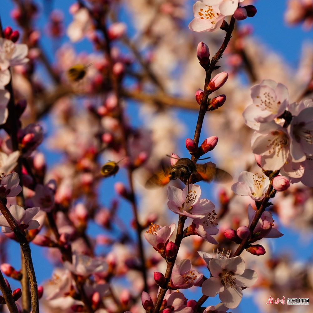 枝头桃花粉艳如云、烂漫盛放,层层花瓣随风轻摇,一树芳华尽染春光,温柔了整座城市。干枝梅粉白相间、凌寒吐艳,无叶缀枝、暗香浮动,在暖阳下尽显清雅风骨。花丛间,蜜蜂穿梭往来、采撷花蜜,彩蝶翩跹起舞、逐花而飞,更有蜂鸟鹰蛾悬停于红白相间的花蕊旁,以细长口器吸食花蜜,勾勒出一幅生机盎然、灵动鲜活的春日画卷。