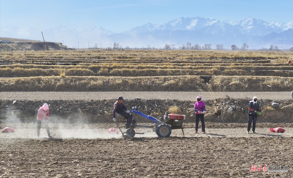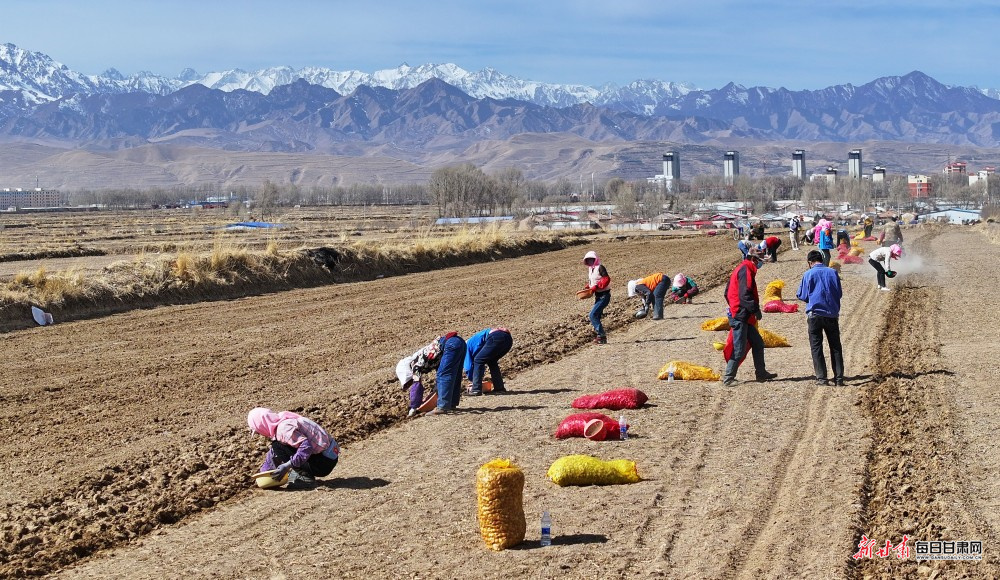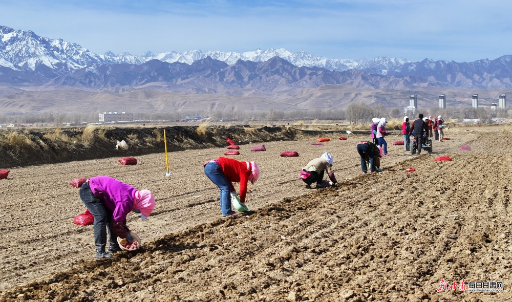 3月11日,民乐县洪水镇刘山村千亩紫皮大蒜种植基地春意盎然,蒜农们抢抓春耕黄金期,全面展开紫皮大蒜种植作业,田间地头呈现出一派繁忙的丰收景象。