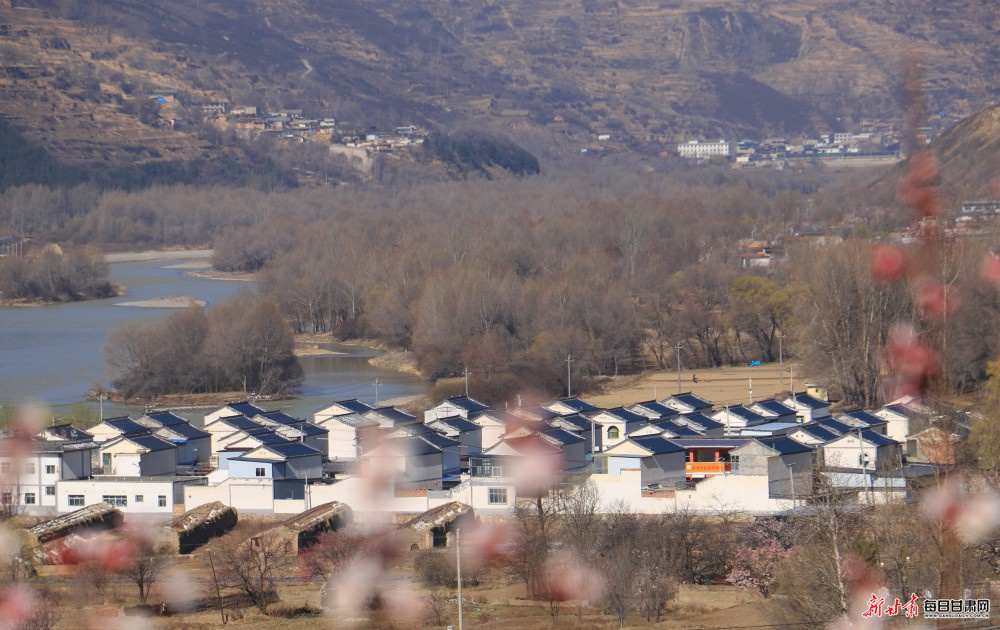 烂漫杏花与错落有致的民居、蜿蜒流淌的洮水相互映衬,勾勒出一幅秀美灵动的乡村春日画卷。