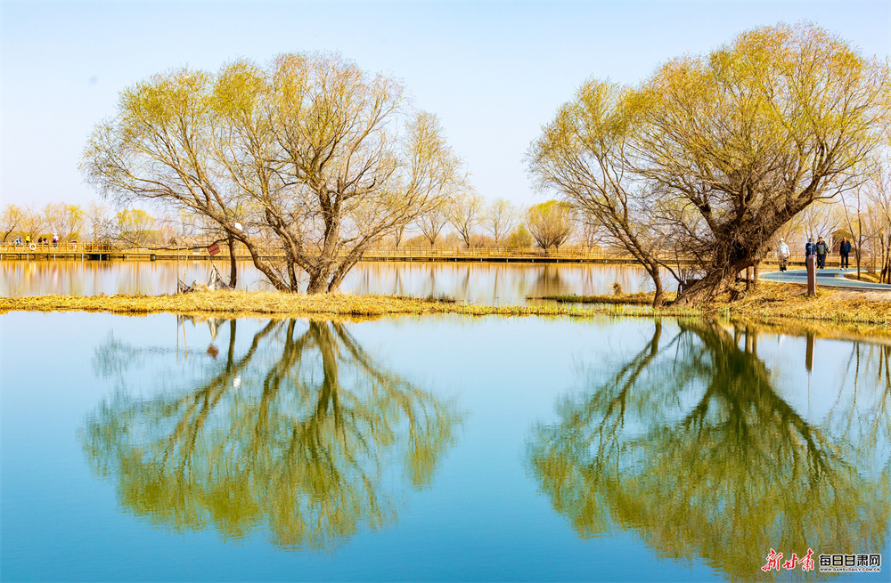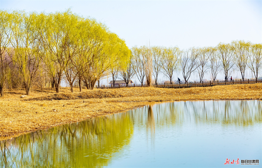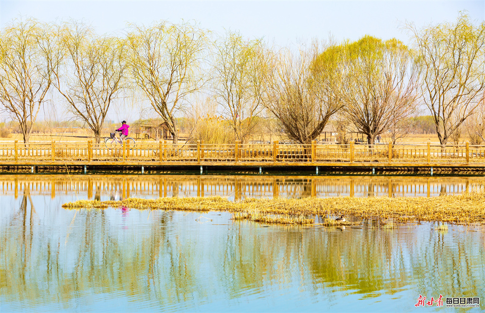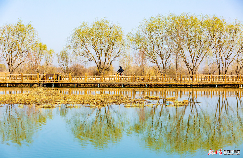 春风拂面,万象更新。张掖国家湿地公园内柳丝泛绿、碧水荡漾,水天一色、风光如画,处处洋溢着蓬勃生机。