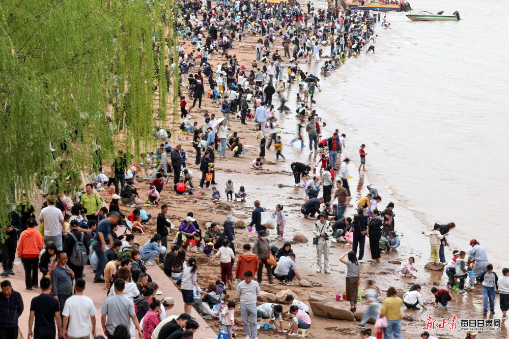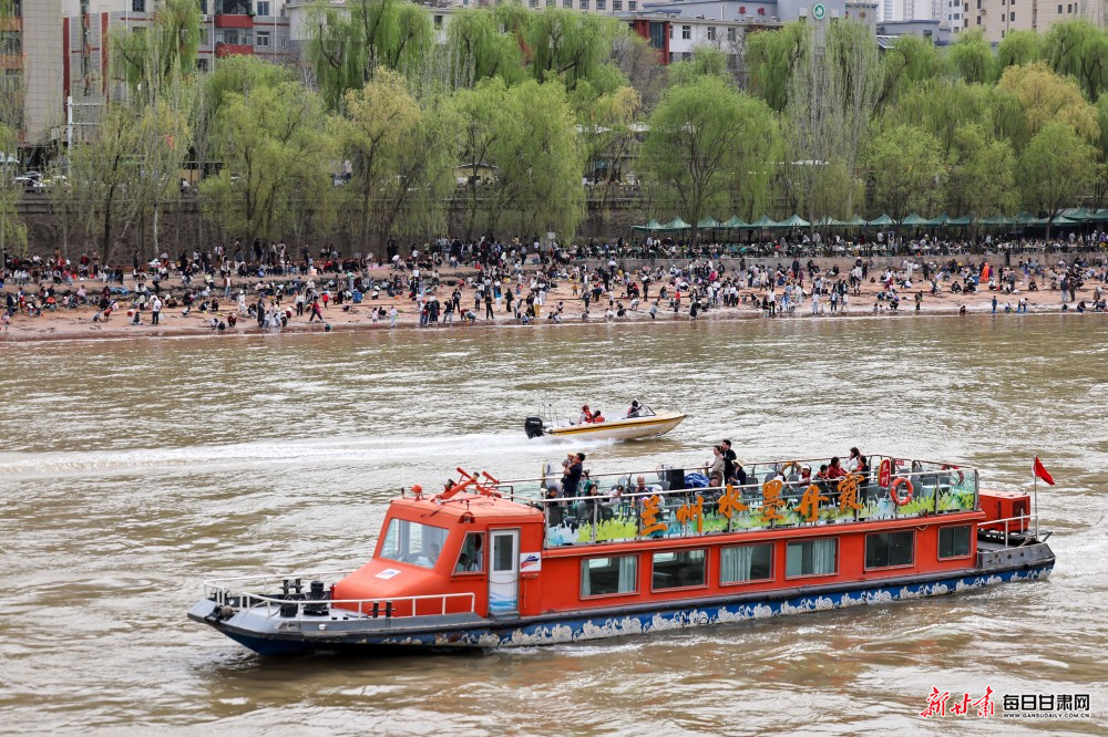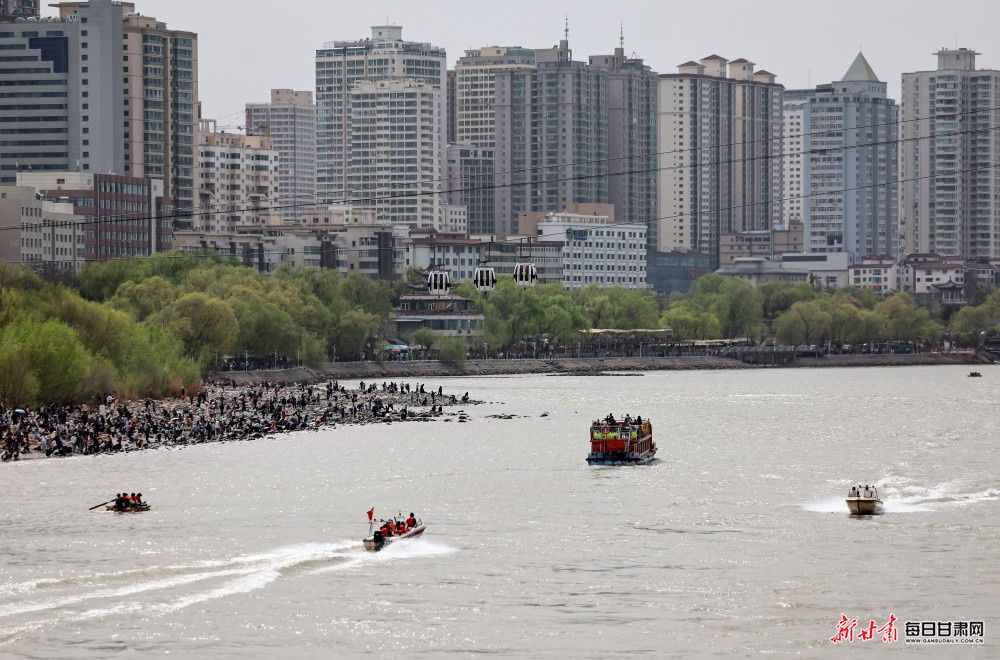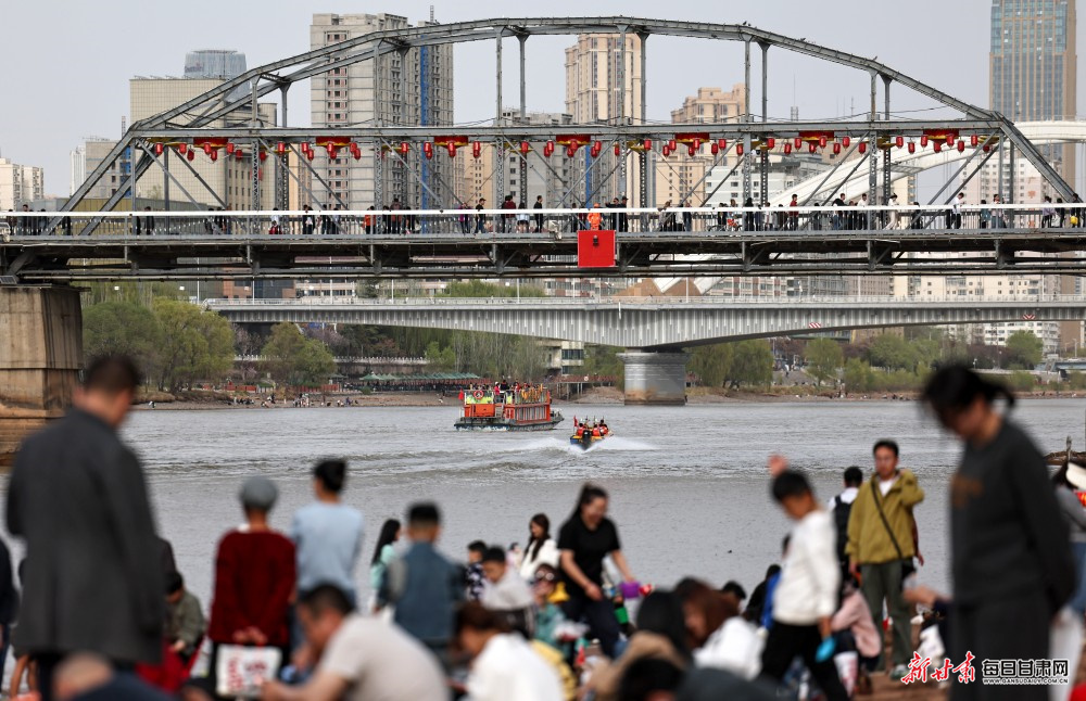 黄河岸边游人络绎不绝,市民或漫步休闲、品茶小憩,或体验快艇、羊皮筏子等特色水上项目,在水光潋滟、春色满城间尽享惬意时光。