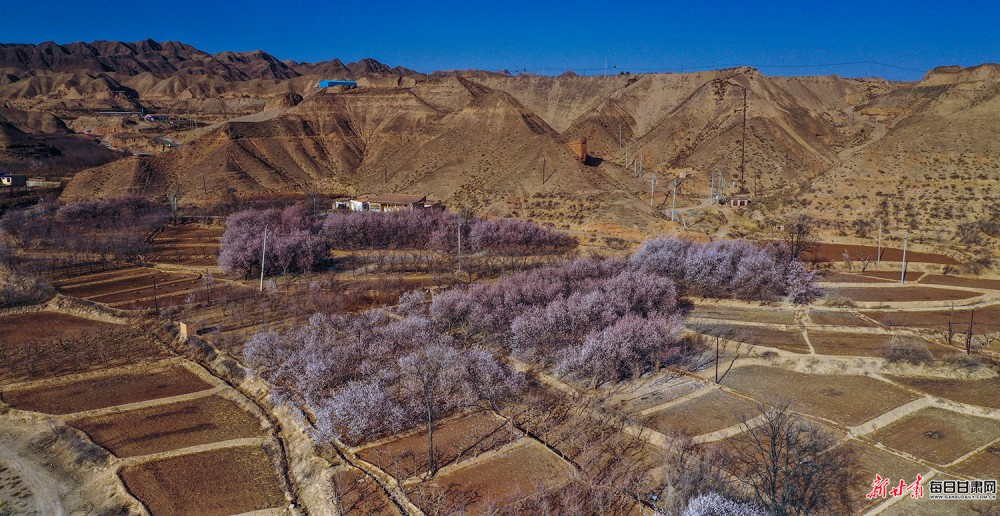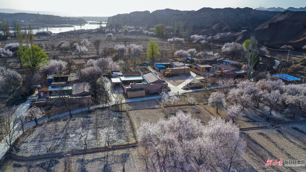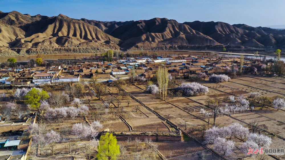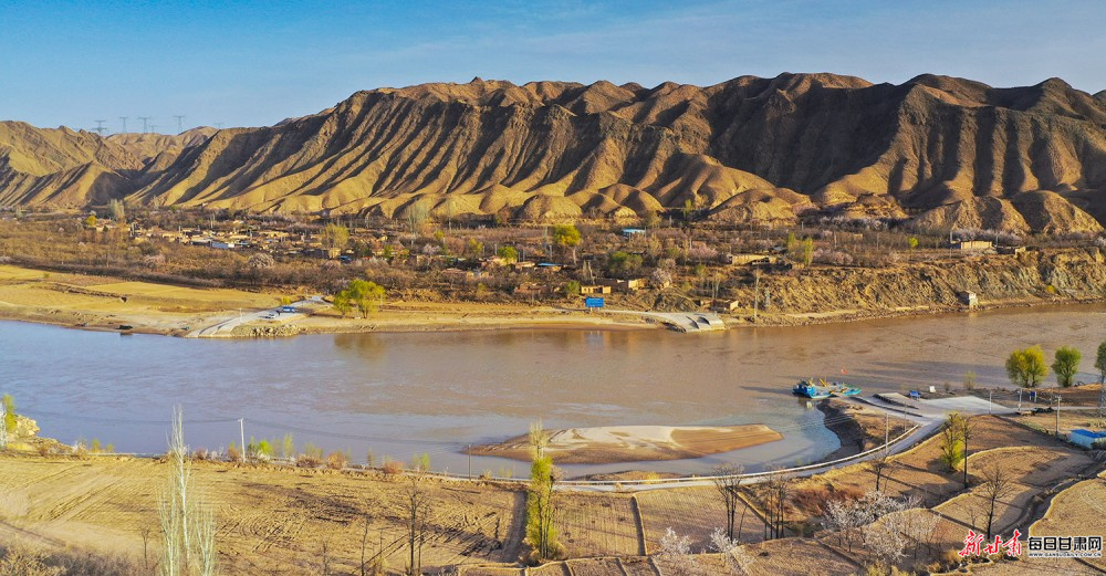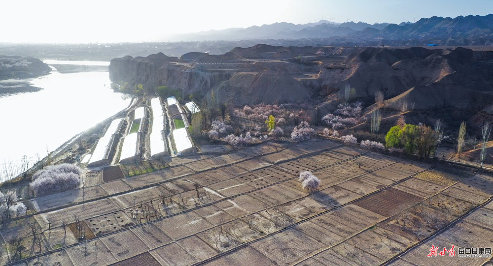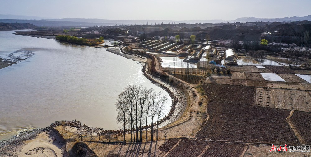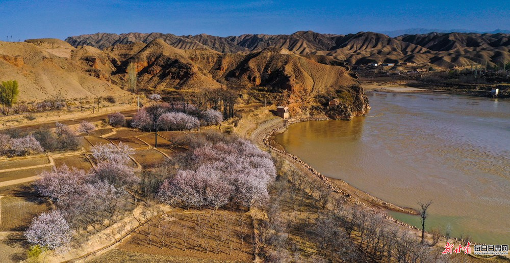 金黄沃野与悠悠黄河相映,粉白杏花、翠绿杨柳点缀其间,勾勒出一幅生机盎然的生态田园画卷,恰似春潮涌动,尽展陇原春日好风光。