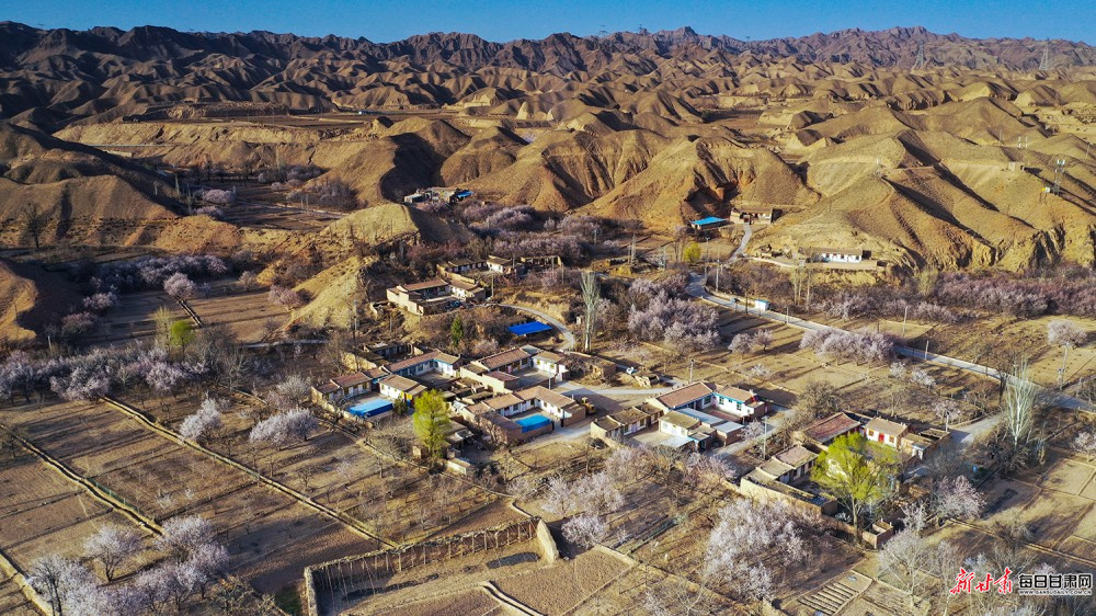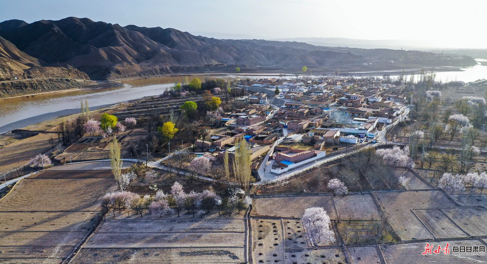 清明时节,春风和煦,繁花竞放。黄河岸边的景泰县五佛乡碱湾、金坪村满目春色,在夕阳映照下,田园村落色彩斑斓,风光如画。