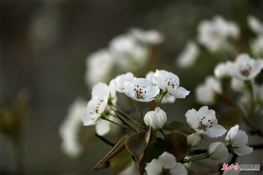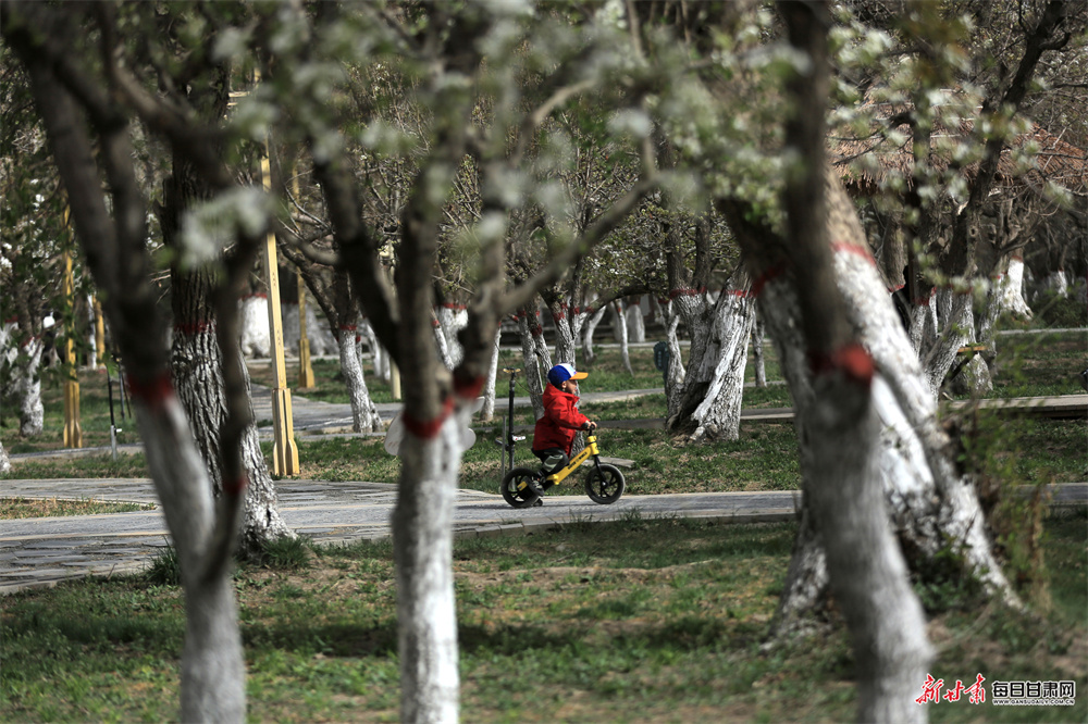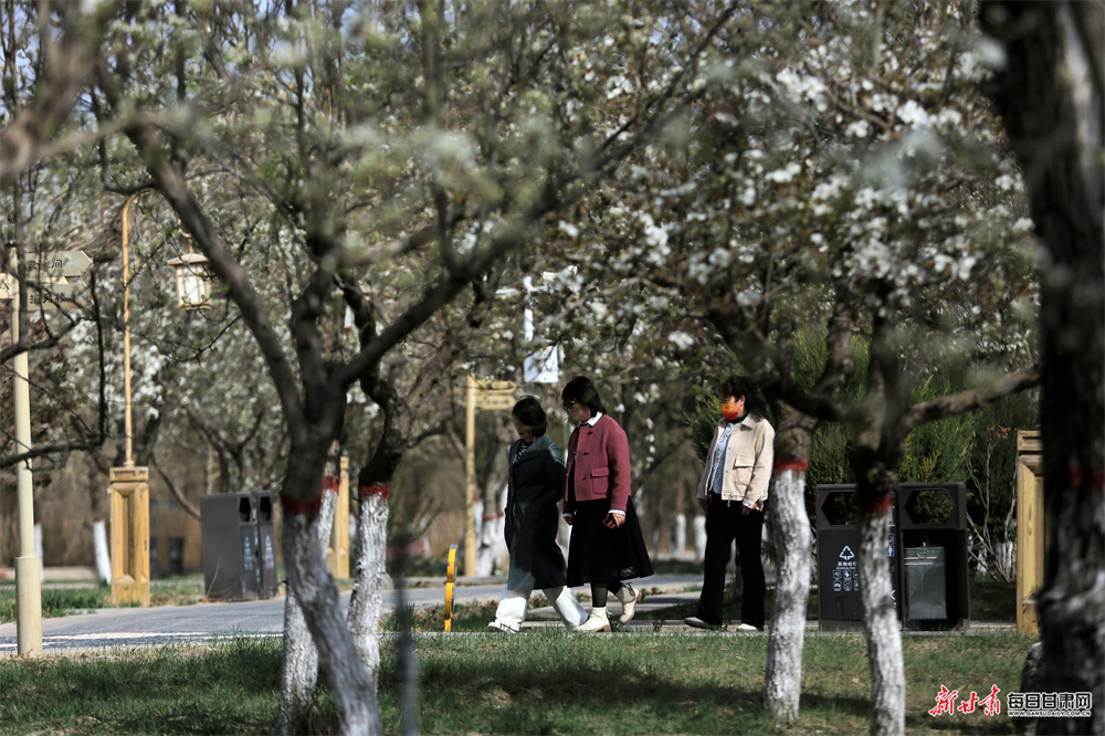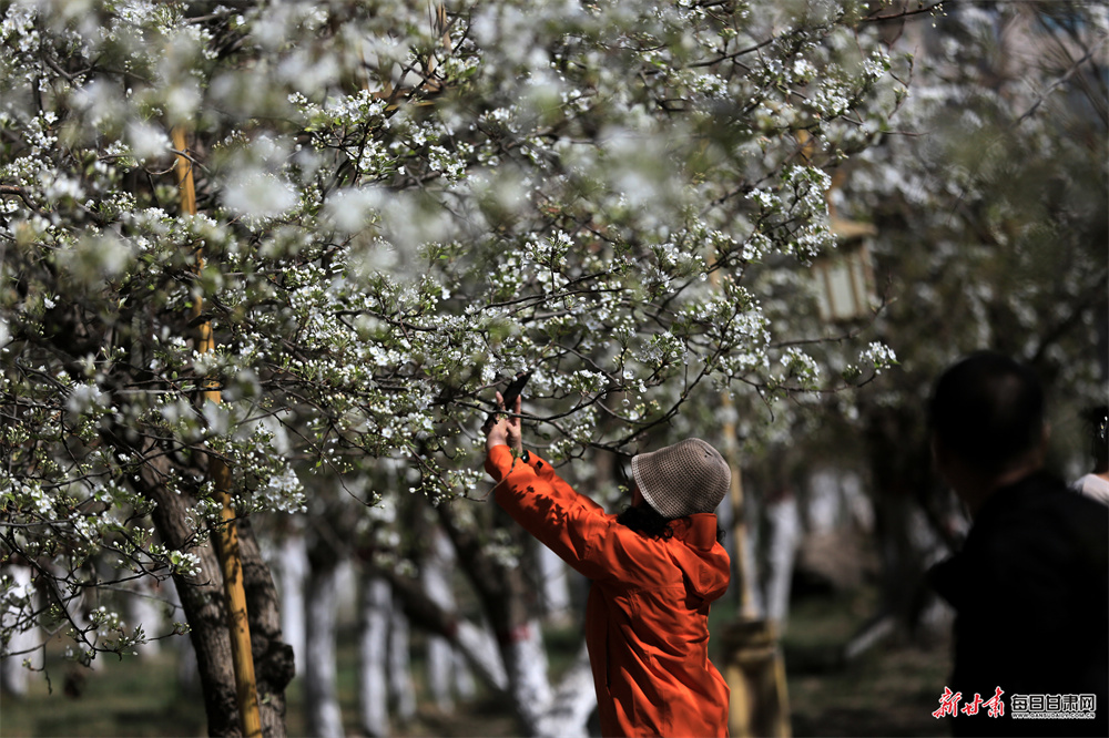 4月9日,张掖市甘州区城北郊百年梨园胡家园子内,梨花竞相绽放、如雪满枝,在晴空映衬下美不胜收,吸引众多市民游客前来踏青赏花、拍照留影,尽享春日美好风光。
