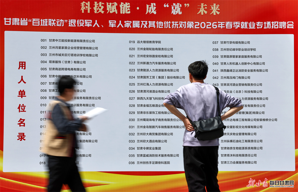 4月11日,甘肃省“百城联动”退役军人、军人家属及其他优抚对象2026年春季就业专场招聘会在兰州举行。活动实现省市县三级联动、全域覆盖,1100余家企业提供岗位2万余个,6000余名求职者入场,达成初步就业意向2746人。