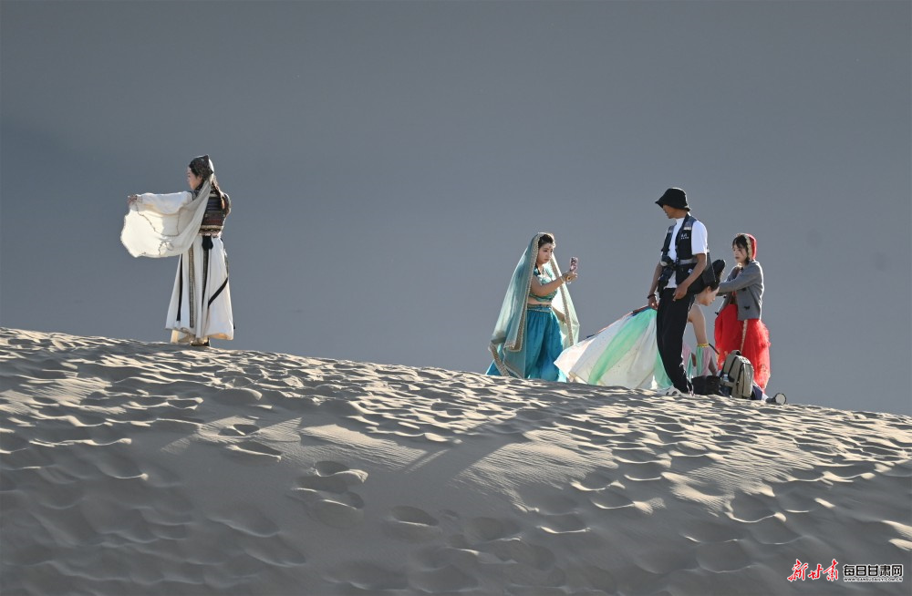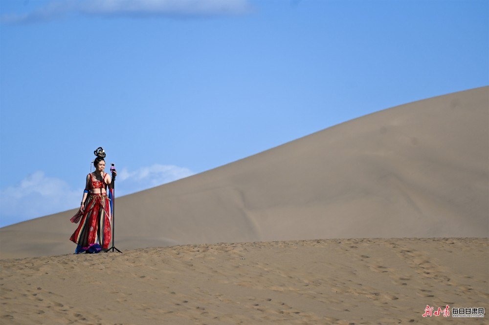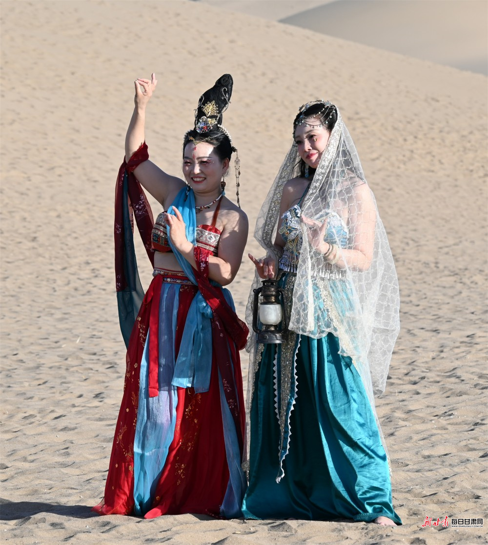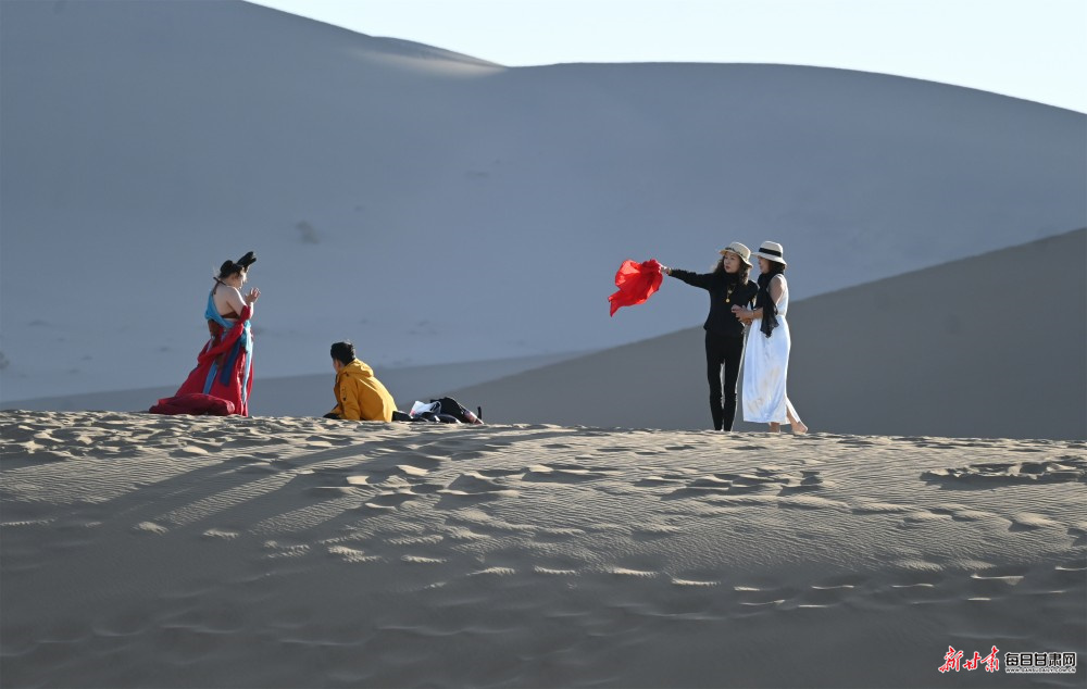 大漠黄沙莽莽,驼铃清音悠扬,月牙泉一泓碧水澄澈如初,千年敦煌的厚重丝路文脉,在春日光影中焕发出全新活力。步入敦煌鸣沙山月牙泉景区,以大漠飞天、西域风情为主题的旅拍热潮持续升温,从日出东方到落日熔金,连绵沙丘、泉边湖畔,随处可见身着精美古风服饰的游客,在摄影师镜头下定格专属大漠的浪漫瞬间,旅拍已然成为鸣沙山下独具特色的文旅新风景线。