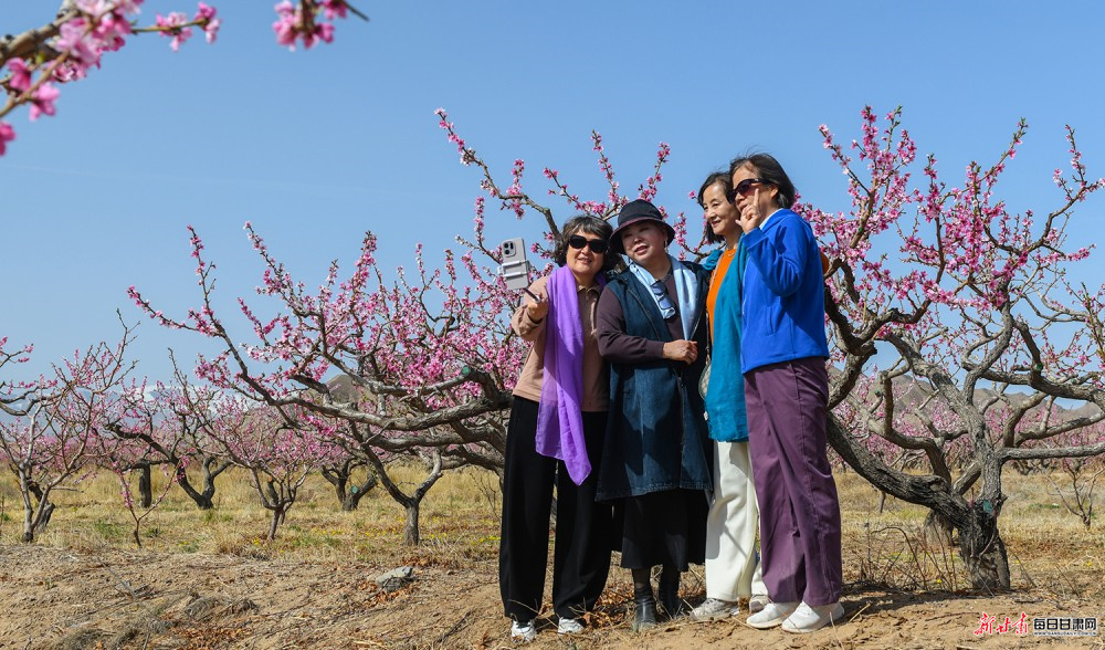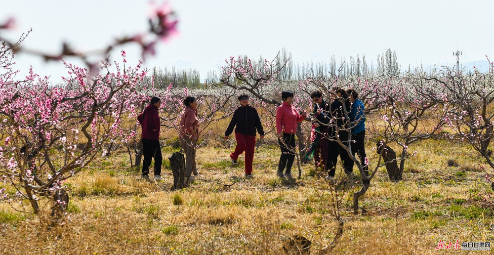园内游人踏青赏景,果农管护劳作,与烂漫繁花相映,尽显春日生机与田园诗意。