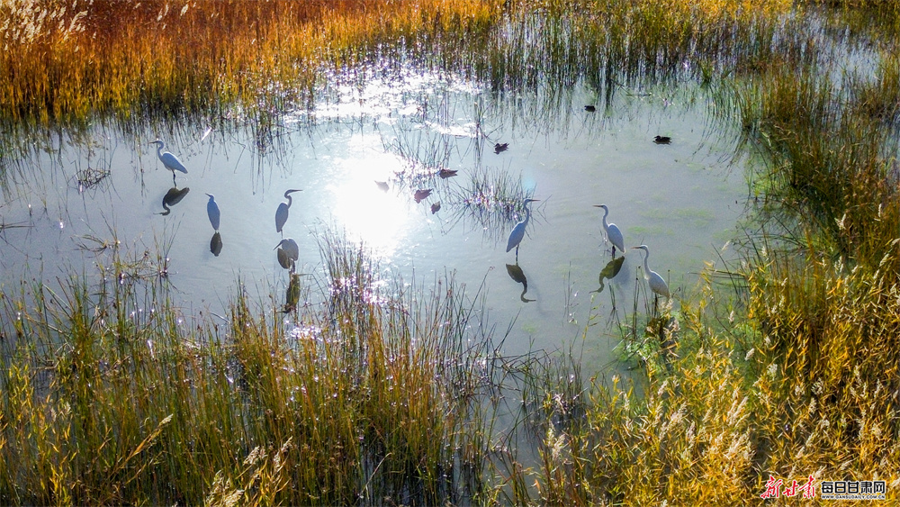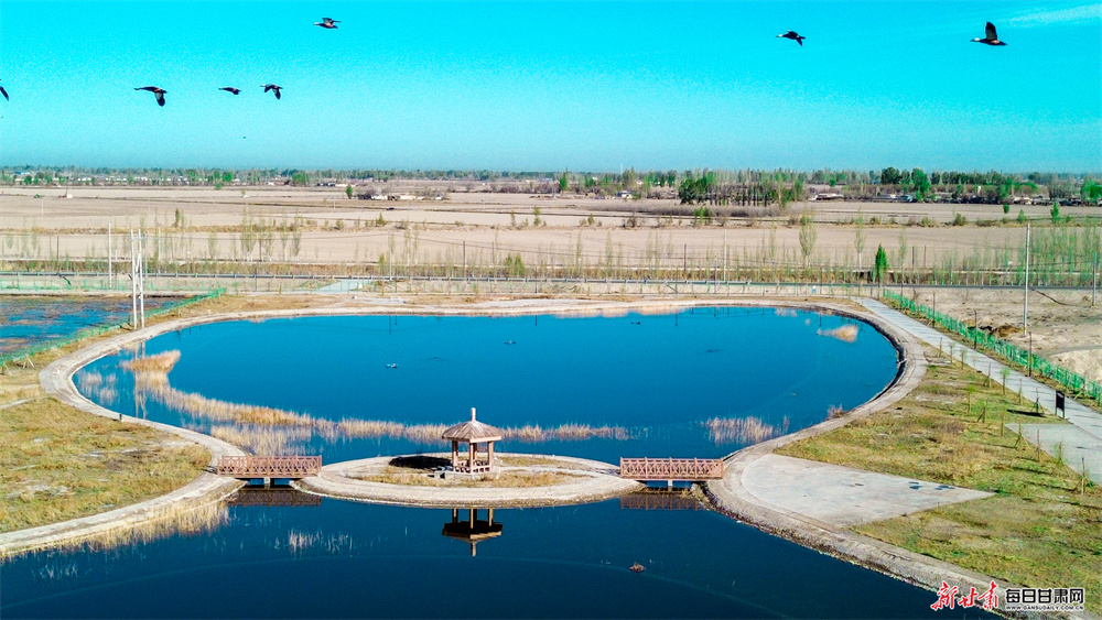 春日,玉门市新市区污水处理厂尾水深度处理及再生水循环利用项目区内,湿地水鸟翩跹翱翔,河渠流水清澈见底,勾勒出一幅灵动的生态美景。