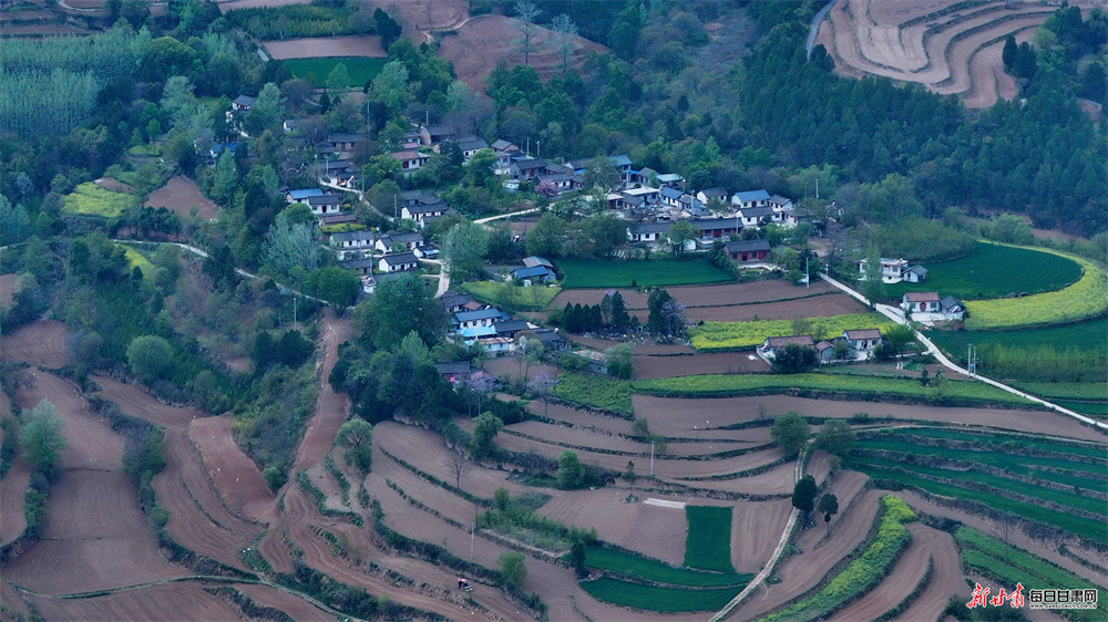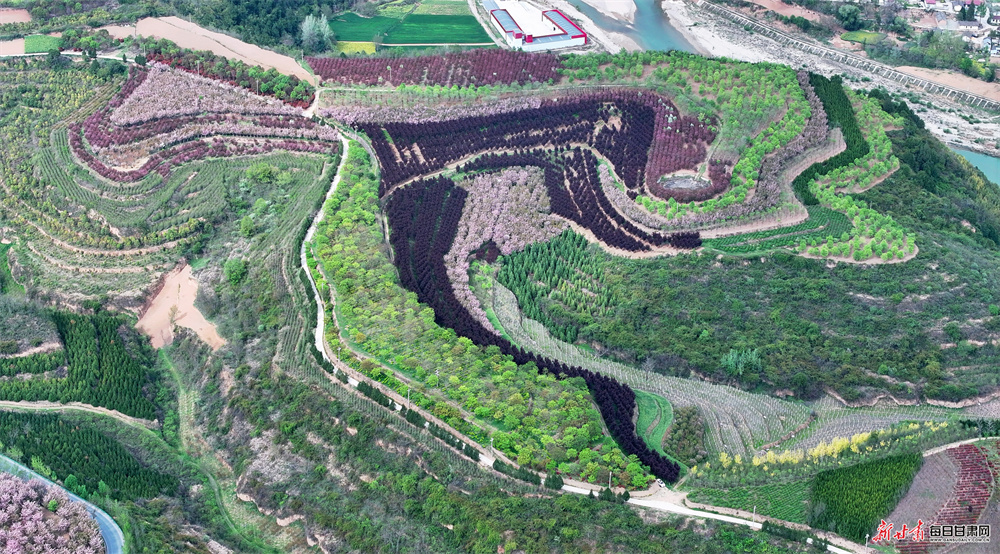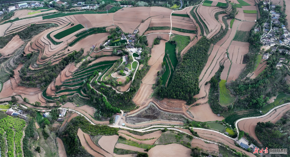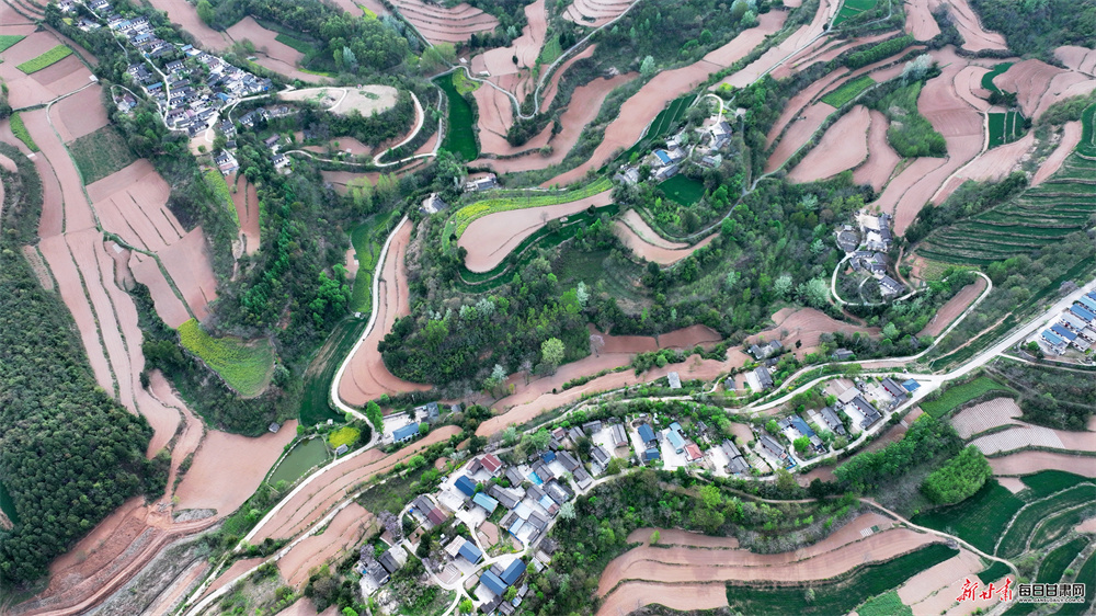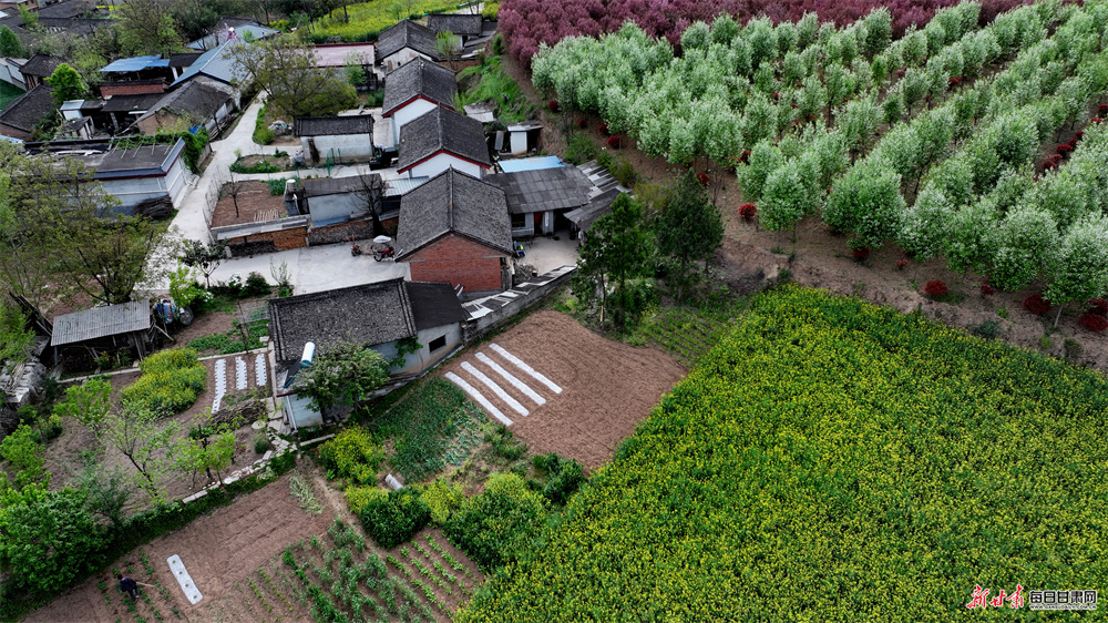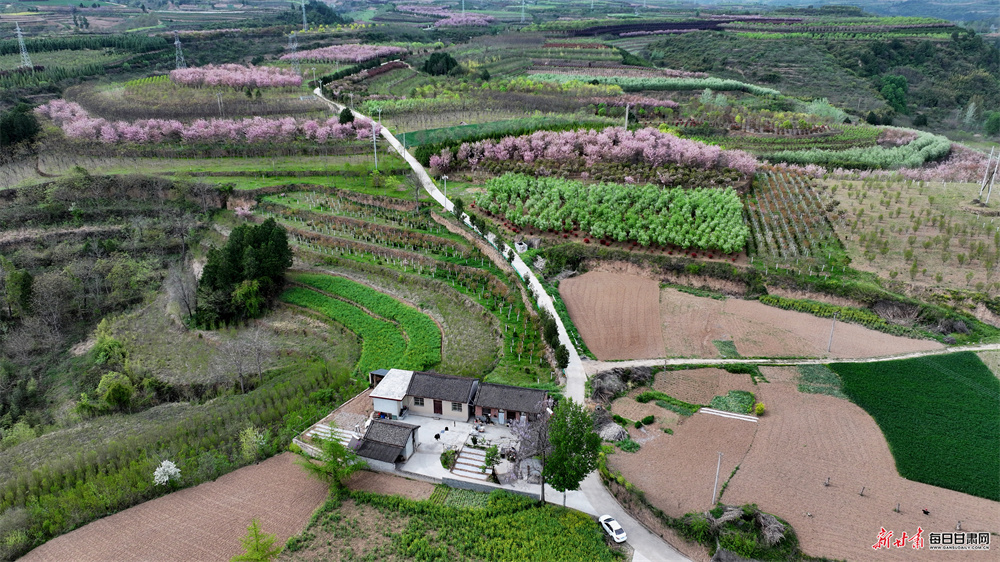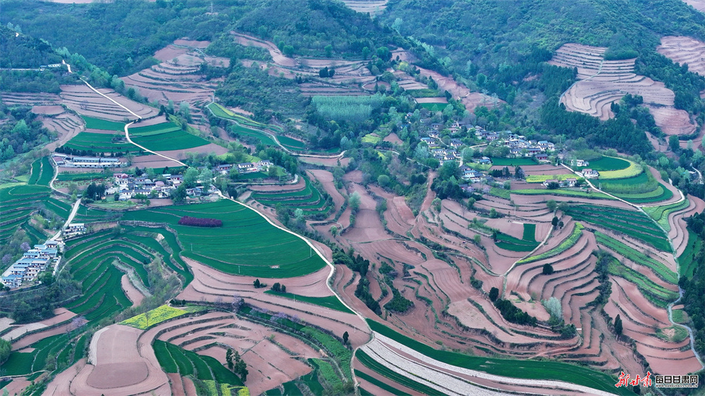 永宁镇坐落于徽县东部,浅山丘陵地貌孕育出独具韵味的梯田景观。历经世代农耕耕耘,连绵起伏的梯田蜿蜒错落、肌理分明,高空俯瞰,纵横交错的田垄宛如大地纹路,曲直相间、错落有致,尽显自然与人文交融的独特美感。田野之间,新绿麦苗长势蓬勃,翻耕沃土色泽温润,洁白地膜整齐排布,金黄花海点缀其间,色彩错落相融;乡间道路两旁,海棠、樱花竞相绽放,繁花缀枝、暗香浮动,与青山林海、古朴村落相映相融,景致悠然诗意。